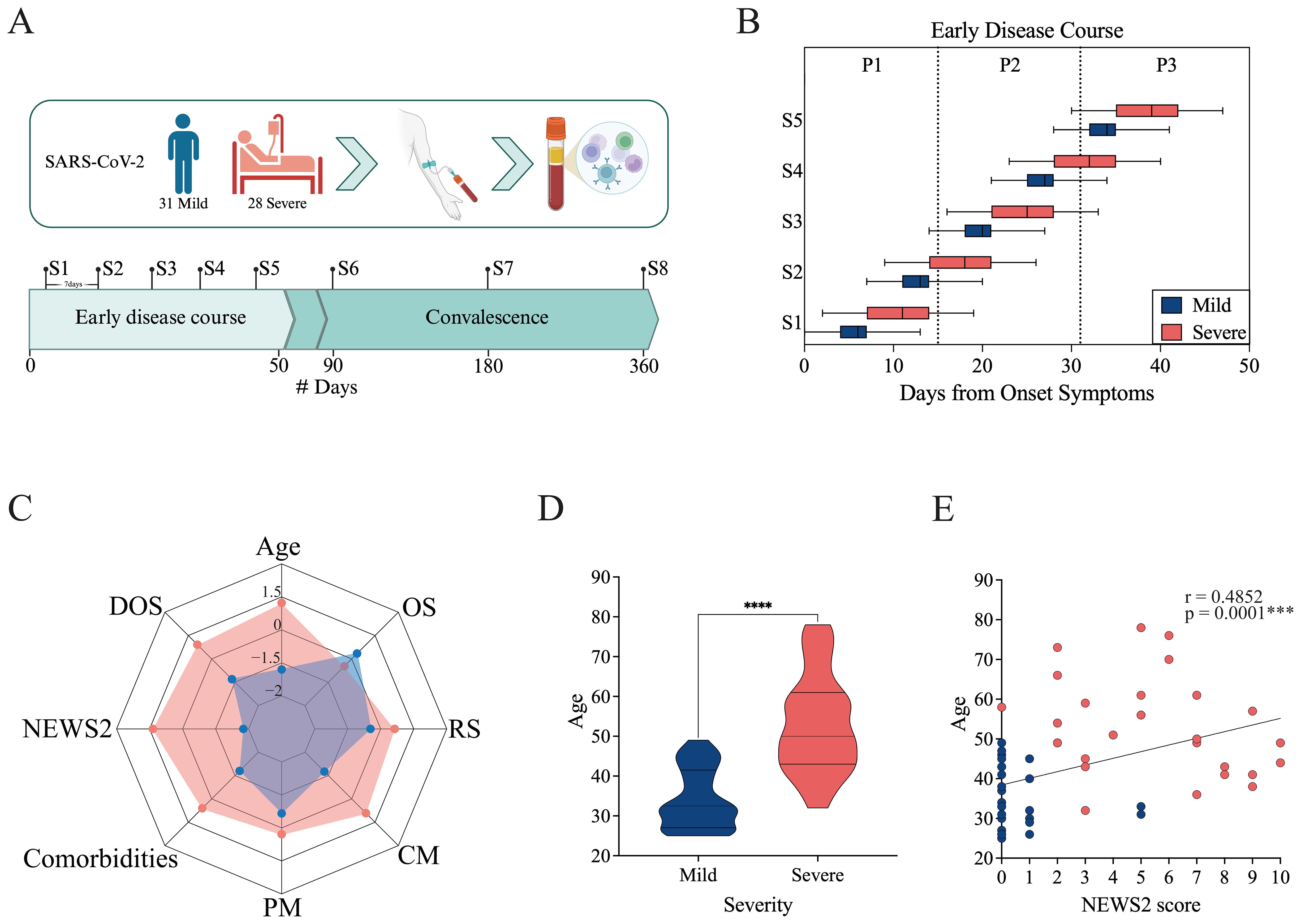 Figure 1. Study overview and cohort characteristics. (A) Longitudinal study design. Individuals infected with SARS-CoV-2 were enrolled, and blood was collected for serum and PBMC isolation. Eight samples (S1–S8) were collected from the day of enrollment up to one year afterward. Samples were collected at 7-day intervals throughout the early disease course (from 0 to 50 Days from Onset of Symptoms, DOS) and during the convalescent period at 90, 180, and 360 DOS. The cohort included 31 mild and 28 severe cases. Created in BioRender. https://BioRender.com/8f99to2 (B) Distribution of sample collection times normalized to the Days from Onset Symptoms for mild (blue) and severe (pink) cohorts. The boxes show the range from minimum to maximum for each cohort, based on the timing of the first five samples collected. The median and error bars are included. (C) Radar plot including demographic and clinical data for the mild (blue) and severe (pink) cohorts. It includes Age, DOS, severity score (NEWS2), Comorbidities, Previous medication (PM), Concomitant medication (CM), Respiratory symptoms (RS), and Other symptoms (OS). (D) Age distribution of mild and severe patients. Differences between groups were evaluated using a non-parametric t-test, with significance levels marked as ****p<0.0001. (E) Correlation between severity score (NEWS2) and age. Spearman correlation coefficients (r) and p-values are shown.