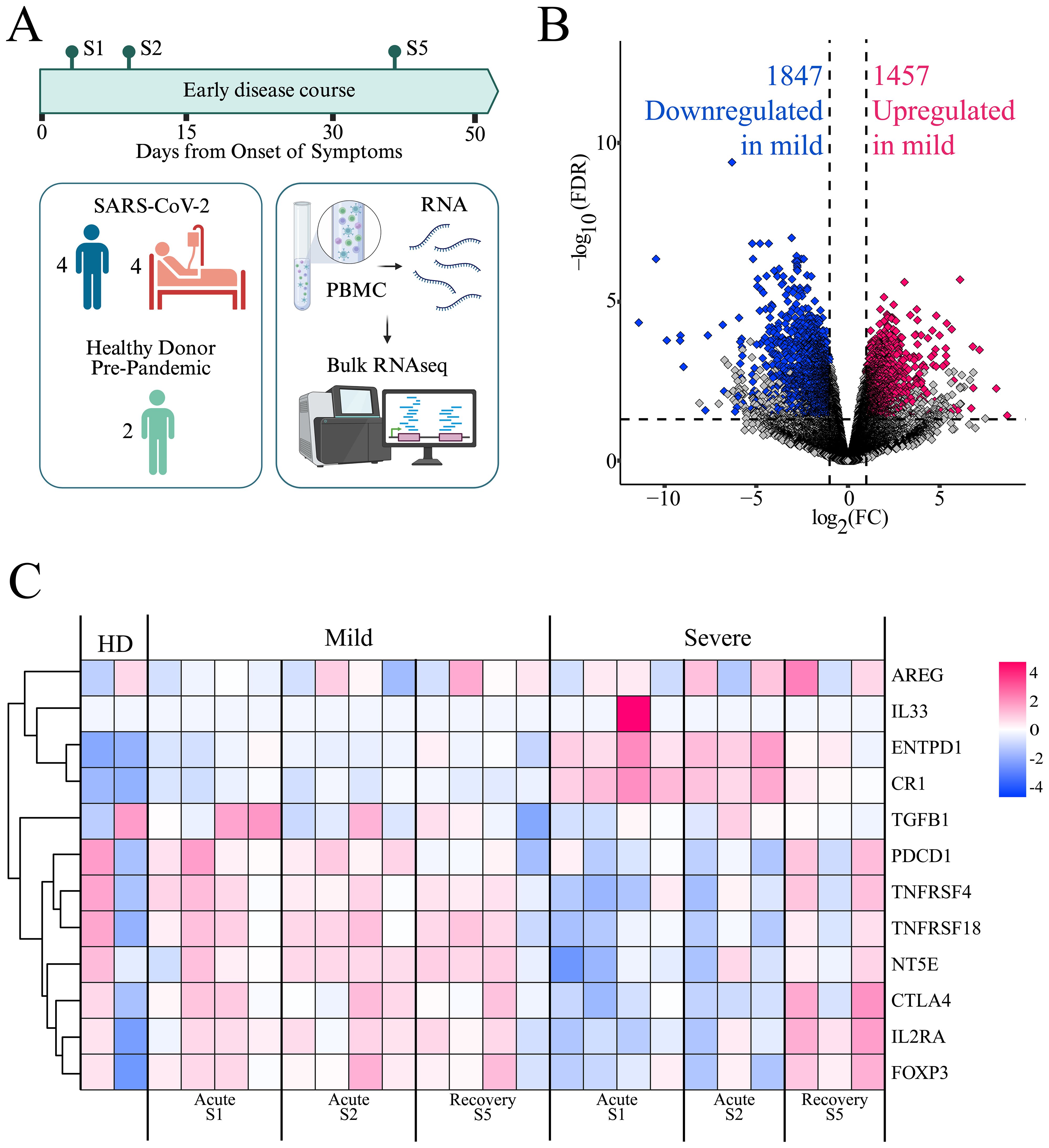 Figure 2. Gene expression profiles in mild and severe COVID-19 patients. (A) PBMCs from a subset of patients, selected based on clinical characteristics and disease severity progression, were analyzed by bulk RNA sequencing. Created in BioRender. https://BioRender.com/ezgmsc0 (B) Volcano plot showing differentially expressed genes (DEGs) between mild and severe cohorts during the acute period (S1 and S2). Pink dots indicate upregulated genes, blue dots indicate downregulated genes, and gray dots represent genes not meeting significance criteria (FDR ≤ 0.05 and log2FC ≥ 1.0). (C) Heatmap displaying the expression of Treg-related genes. Each column represents a patient at a specific time point (mild or severe, at S1, S2, and S5), including two healthy donors (HD). Rows represent genes clustered by expression similarity, as indicated by the dendrogram on the left. Pink indicates higher expression and blue indicates lower expression, based on log(TPM + 1) values.