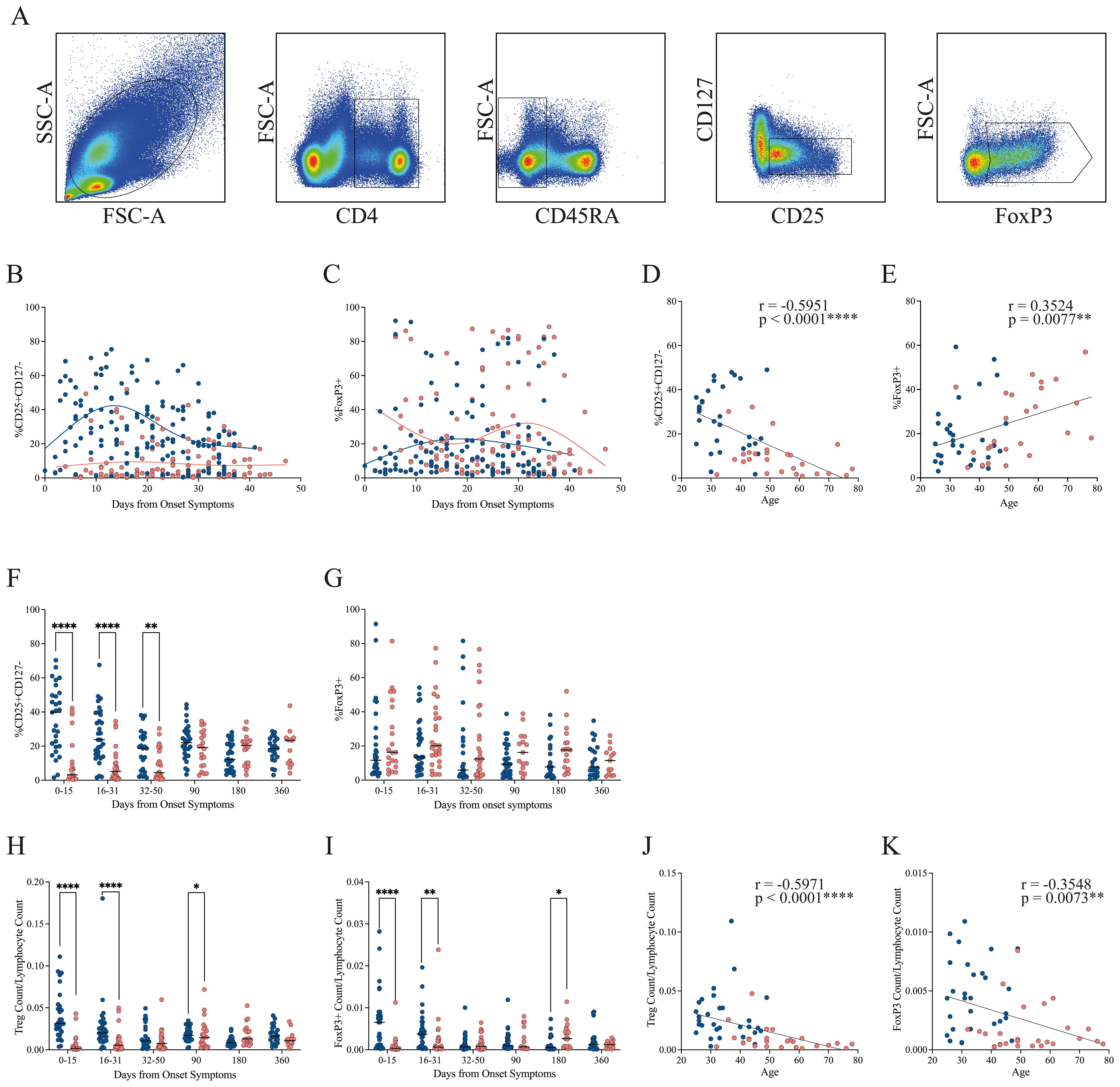 Figure 3. Progression of Treg frequency in mild and severe COVID-19 patients. (A) Representative gating strategy showing lymphocyte identification, CD4+ selection, exclusion of CD45RA+ naïve cells, and subsequent gating of activated Tregs (CD25+CD127−) and FoxP3+ subsets. (B, C) Temporal dynamics of activated Treg and FoxP3+ Treg frequencies, respectively, during the early disease course. Loess regression curves illustrate trends for mild (blue, n = 31) and severe (pink, n = 28) cohorts. (D, E) Correlation between patient age and the frequency of activated Tregs or FoxP3+ Tregs, respectively, during the early disease course. Spearman correlation coefficients (r) and p-values are shown. (F, G) Cumulative frequencies of activated Tregs and FoxP3+ Tregs across three intervals: P1 (0–15 DOS), P2 (16–31 DOS), and P3 (32–50 DOS), as well as at follow-up (90, 180, and 360 DOS). Differences between cohorts were evaluated using a non-parametric t-test, with significance levels marked as **p < 0.01 and ****p < 0.0001. (H, I) Cumulative cell count of activated Tregs and FoxP3+ Tregs across three intervals: P1 (0–15 DOS), P2 (16–31 DOS), and P3 (32–50 DOS), as well as at follow-up (90, 180, and 360 DOS). Differences between cohorts were evaluated using a nonparametric t-test, with significance levels indicated as *p < 0.05 and ****p < 0.0001. (J, K) Correlation between patient age and the cell count of activated Tregs or FoxP3+ Tregs, respectively, during the early disease course. Spearman correlation coefficients (r) and p-values are shown.