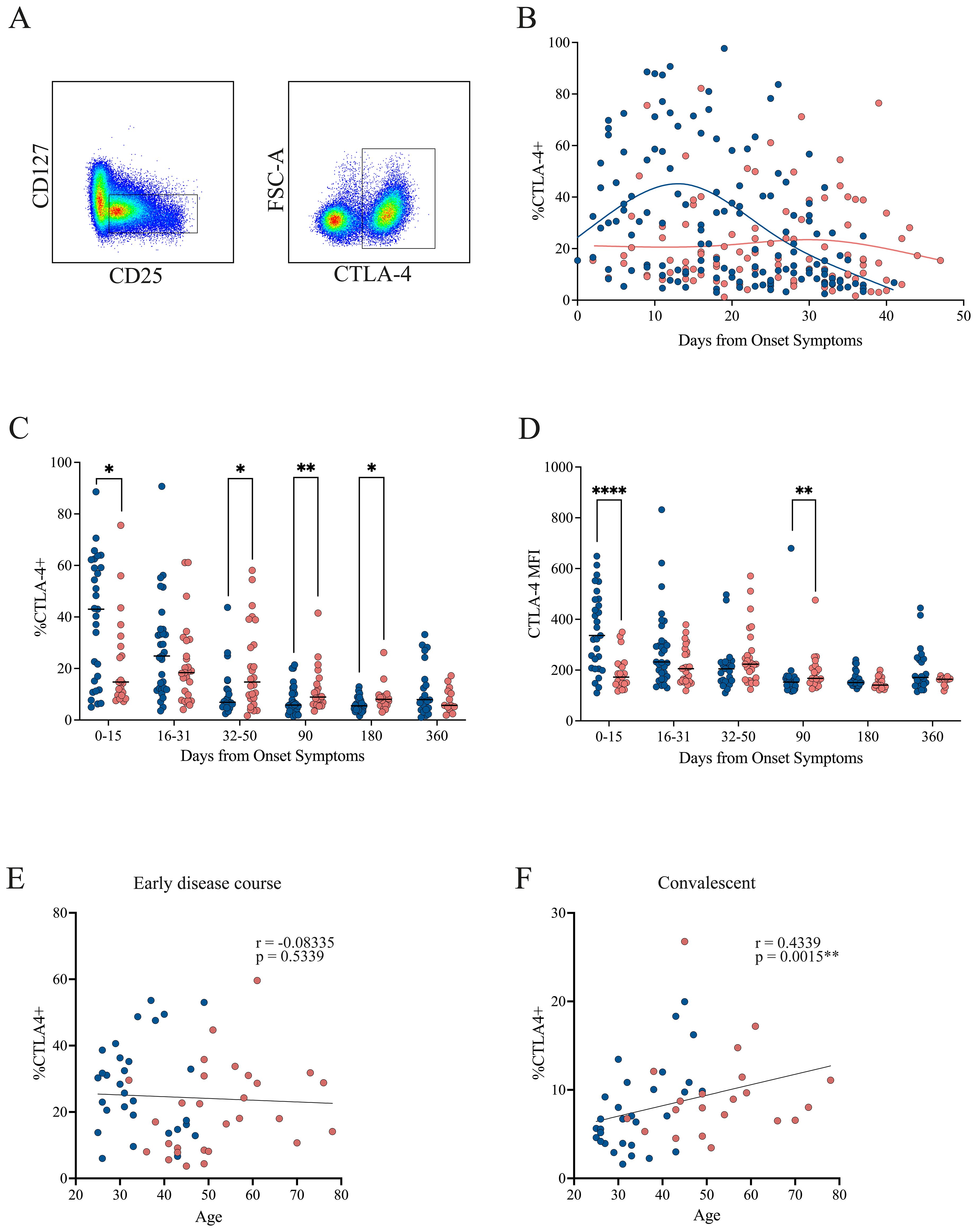 No correlation between CTLA-4 expression and age was detected during the early disease course (Figure 4E). However, during the convalescent phase, when CTLA-4 levels increased in the severe cohort, a positive correlation with age emerged (Spearman’s r = 0.4339, p = 0.0015; Figure 4F), suggesting that these cells may undergo age-associated phenotypic or functional changes.