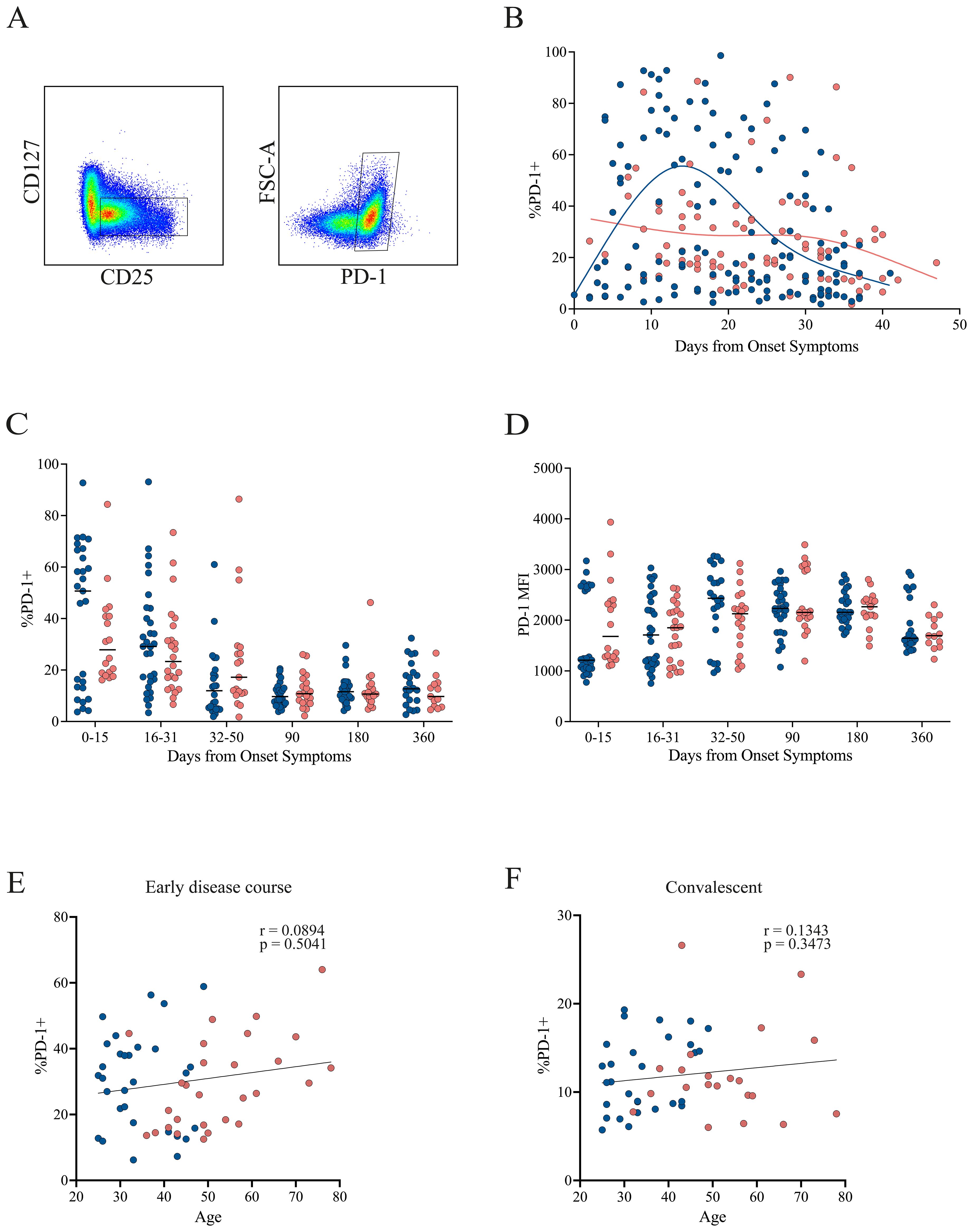 Figure 5. PD-1 expression in Tregs from mild and severe COVID-19 patients. (A) Representative gating strategy identifying activated Tregs (CD4+CD45RA−CD25+CD127−), followed by assessment of PD-1 expression within this population. (B) Temporal dynamics of PD-1+ Treg frequencies during the early disease course, with loess regression curves for mild (blue) and severe (pink) cohorts. (C) Cumulative frequencies of PD-1+ Tregs across three intervals: P1 (0–15 DOS), P2 (16–31 DOS), and P3 (32–50 DOS), as well as at follow-up (90, 180, and 360 DOS). (D) Cumulative MFI of CTLA-4+ Tregs across three intervals: P1 (0–15 DOS), P2 (16–31 DOS), and P3 (32–50 DOS), as well as at follow-up (90, 180, and 360 DOS). (E, F) Correlation between patient age and the frequency of PD-1+ Tregs in the early disease course and convalescent phase, respectively. Spearman correlation coefficients (r) and p-values are shown.