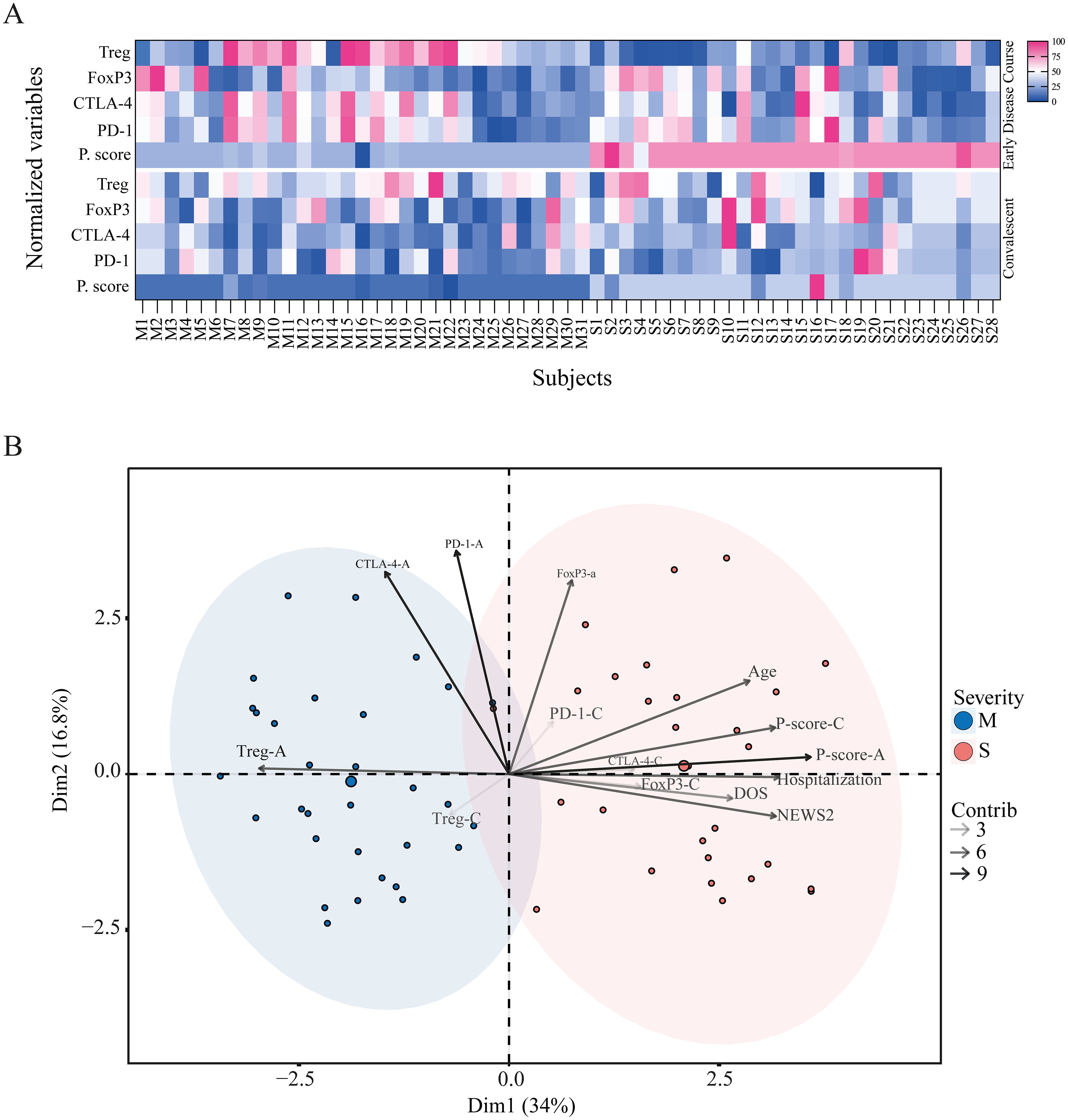Figure 7. Divergent Treg-related phenotypes in mild and severe COVID-19 patients. (A) Heatmap of Treg-related phenotype during the acute and convalescent phases. Each column represents one subject (M, mild; S, severe), and each row shows normalized values for Treg frequency, FoxP3+ Treg frequency, CTLA-4+ Treg frequency, PD-1+ Treg frequency, and proliferation score. The upper panel corresponds to the early disease course, and the lower panel corresponds to the convalescent phase. (B) Principal component analysis (PCA) of mild (blue) and severe (pink) cohorts based on demographic variables such as age, sex, severity score (NEWS2), hospitalization status, and Treg phenotype parameters. Variance explained by Dimension 1 and Dimension 2 is 34% and 16.8%, respectively. The contribution of each variable to the PCA is represented by arrows of increasing grayscale intensity corresponding to contribution scores of 3, 6, and 9.