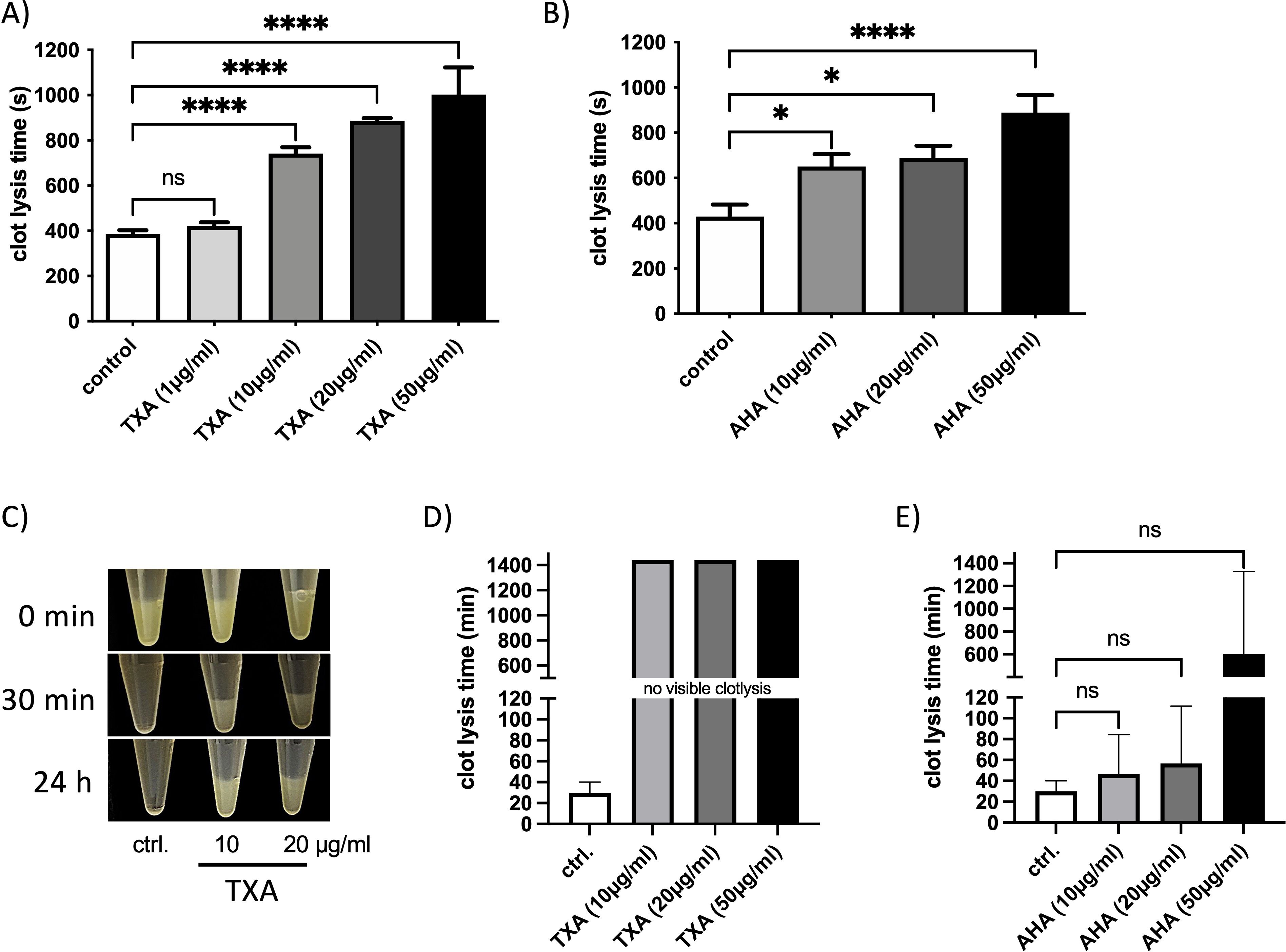 Figure 1. Clot lysis – induced by streptokinase or GAS – is inhibited in the presence of therapeutic doses of TXA and AHA. Pooled plasma with buffer (control) or TXA (A) AHA (B) at concentrations of 1, 10, 20, and 50 µg/ml, respectively was placed in a coagulometer. Clot formation was initiated by the addition of thromboplastin. Following an additional incubation period of 2 minutes, streptokinase was administered to the samples, and the time to clot dissolution was recorded. Data are presented as mean values ± standard deviations (n = 7 experiments for TXA and n = 8 experiments for AHA). Statistical significance was assessed using one-way analysis of variance (ANOVA) followed by Dunnett’s post hoc test. *p < 0.0107, **p < 0.0099, ***p < 0.0002, ****p < 0.0001. (C-E) A plasma clot was generated by incubating pooled plasma with a logarithmic GAS suspension (2x109 CFU/ml), thrombin (1 Unit), TXA or AHA at 10 or 20 µg/ml or PBS as control (ctrl.). The clot was overlaid with PBS and the time to complete dissolution was documented photographically (C), or measured in a coagulometer (D, E). The data show the mean values and standard deviations of n=3 different experiments. The positive control was chosen as the reference when calculating significance in the one-way ANOVA with Dunnett’s test.