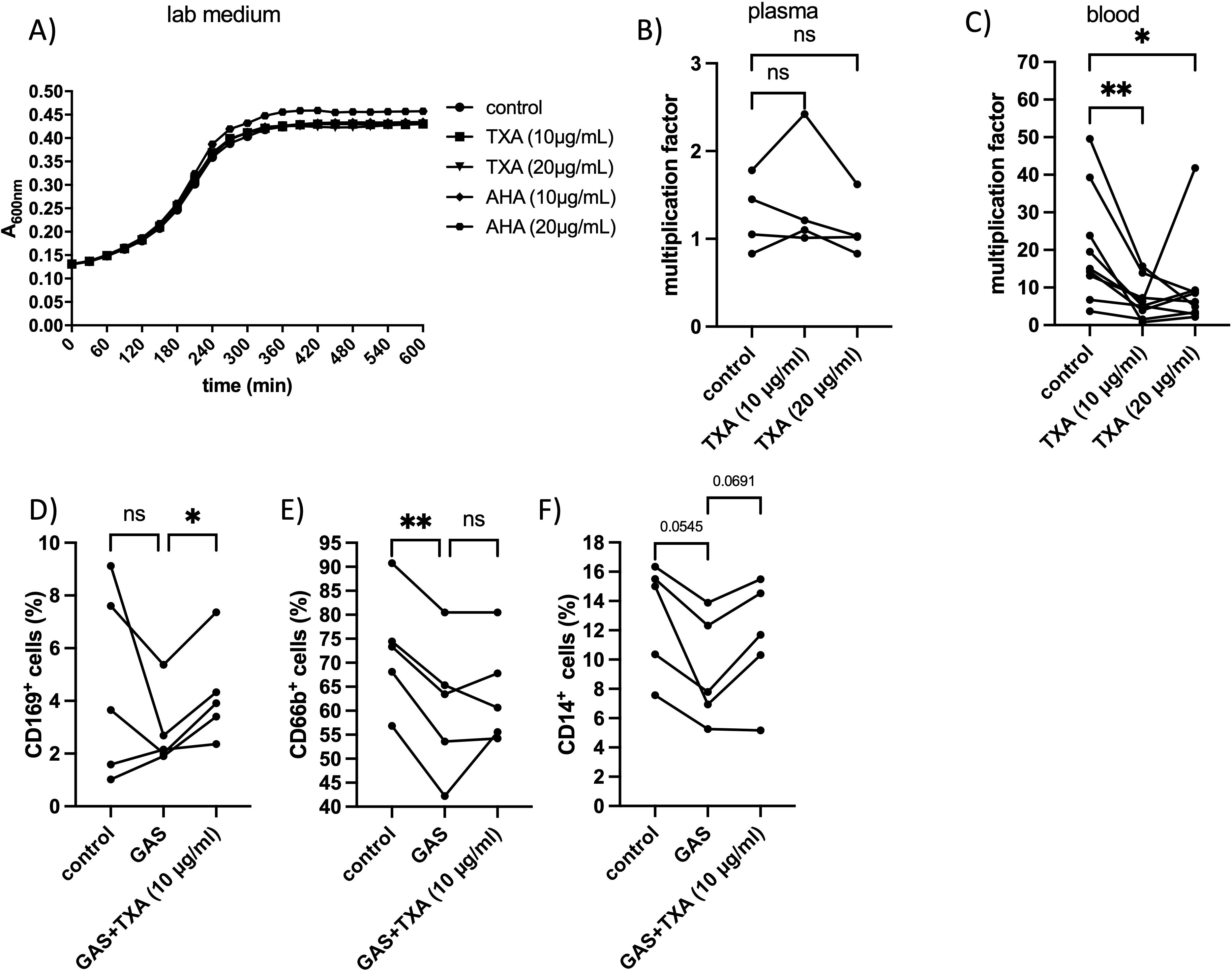Figure 3. GAS growth and multiplication factor and changes in immune cell markers after treatment with TXA and/or AHA. (A) Bacteria were incubated in lab medium with TXA and AHA at indicated concentrations, or PBS as control. The increase in optical density at 600 nm was measured photometrically. (B) An overnight GAS culture (2x109 CFU/ml) was mixed with pooled human plasma (derived from 4 healthy donors) and TXA at indicated concentrations. In the control, buffer was used instead of TXA. After a four-hour incubation period at 37°C, the surviving bacteria were determined by plating and the multiplication factor was calculated from the number of the initially added bacteria and the number of the surviving bacteria. n=4 different experiments. Significance was tested using the Friedman test followed by the Dunn test. (C) Human whole blood was incubated with GAS in the early exponential growth phase and TXA at indicated concentrations or buffer for the control. After a four-hour incubation period at 37°C, the surviving bacteria were determined by plating and the multiplication factor was calculated from the number of the initial added bacterial and the number of the surviving bacteria. Blood from 9 healthy donors was used. Significance was determined using the Friedman test followed by the Dunn test *p=0.0190, **p = 0.0044. (D-F) Citrated blood was incubated with GAS in the presence or absence of TXA (10 and 20 µg/ml). After 4 hours of incubation at 37°C, the blood samples were incubated with anti CD169 (D), anti CD66b (E) or anti CD14 (F) and measured on the FACSVerse (see material methods). Blood from five healthy donors was used. Significance was determined using the RM one-way ANOVA for paired samples followed by Dunnett’s test; **p < 0.0055. In the experiment with the CD169 antibody the Friedman test followed by Dunn’s test was used.