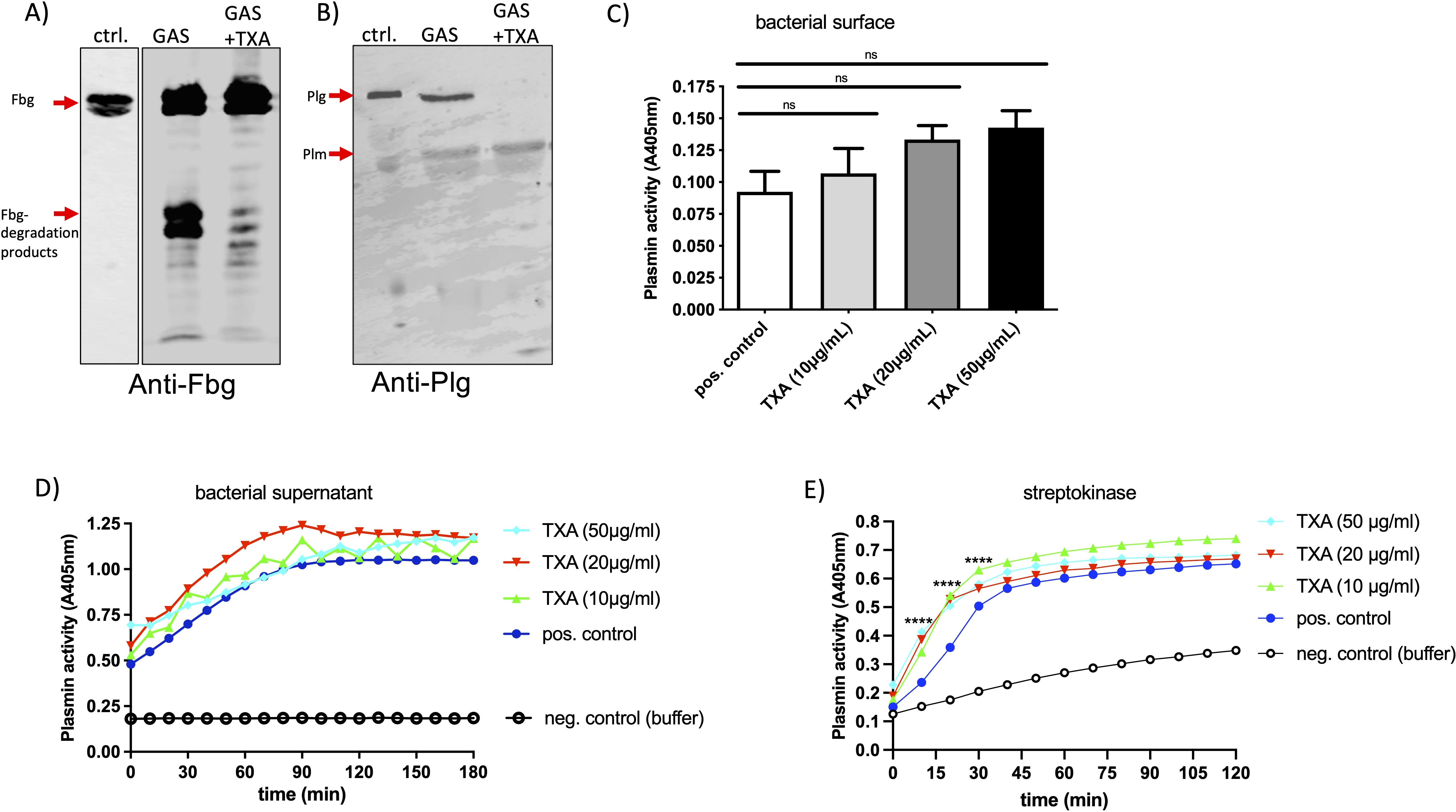 Figure 4. TXA reduces fibrinogen degradation and plasminogen binding to the GAS surface, without inhibiting plasmin activity. Bacteria (1x1010 CFU/ml) were incubated in pooled plasma in the presence of 10 µg/ml TXA (GAS+TXA). After incubation bacteria were washed and the adsorbed proteins were eluted from the surface. Western Blot analysis of the eluates was performed with an antibody against fibrinogen [(A), anti-Fbg] or plasminogen [(B), anti-Plg]. As control (ctrl.) plasma with buffer was used. (C) GAS-bacteria (2x109 CFU/ml) were incubated in pooled plasma (1:1) in the presence of indicated TXA concentrations. After incubation bacteria were washed three times with Tris-buffer and plasmin activity was determined using the substrate S-2403, specific for plasmin. Significance was tested by One-way ANOVA and Dunnett’s multiple comparisons test. (D, E) Bacterial supernatant (D) or streptokinase (E) was mixed with pooled plasma and indicated TXA concentrations, S-2403 was added and absorption was measured. Significance was tested by two-way ANOVA and Tukeys multiple comparisons test, ****p<0.0001 at indicated time points.