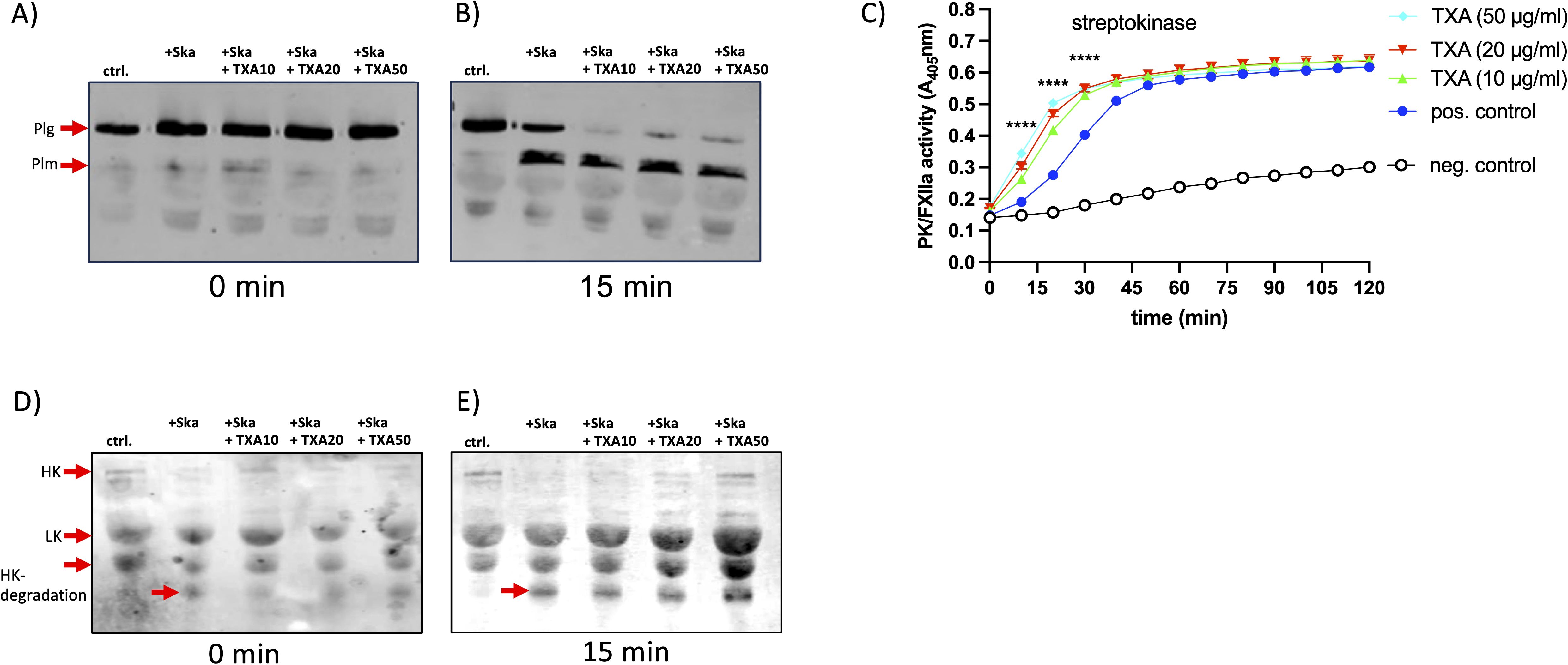 Figure 5. TXA slightly enhanced plasmin- or plasma kallikrein activity, induced by streptokinase Streptokinase (Ska, 10 Units) was incubated in pooled plasma with TXA at 10 (Ska+TXA10), 20 (Ska+TXA20) or 50 µg/ml (Ska+TXA50). PBS instead of streptokinase was used as control (ctrl.). Samples at time point zero and after 15 min were investigated by Western blot with an antibody against plasminogen (plg, (A, B) or HK (D, E). (C) Streptokinase was mixed with plasma and indicated TXA concentrations, S-2303, specific for PK activity, was added and absorption was measured. Significance was tested by two-way ANOVA and Tukeys multiple comparisons test, ****p<0.0001 at indicated time points.