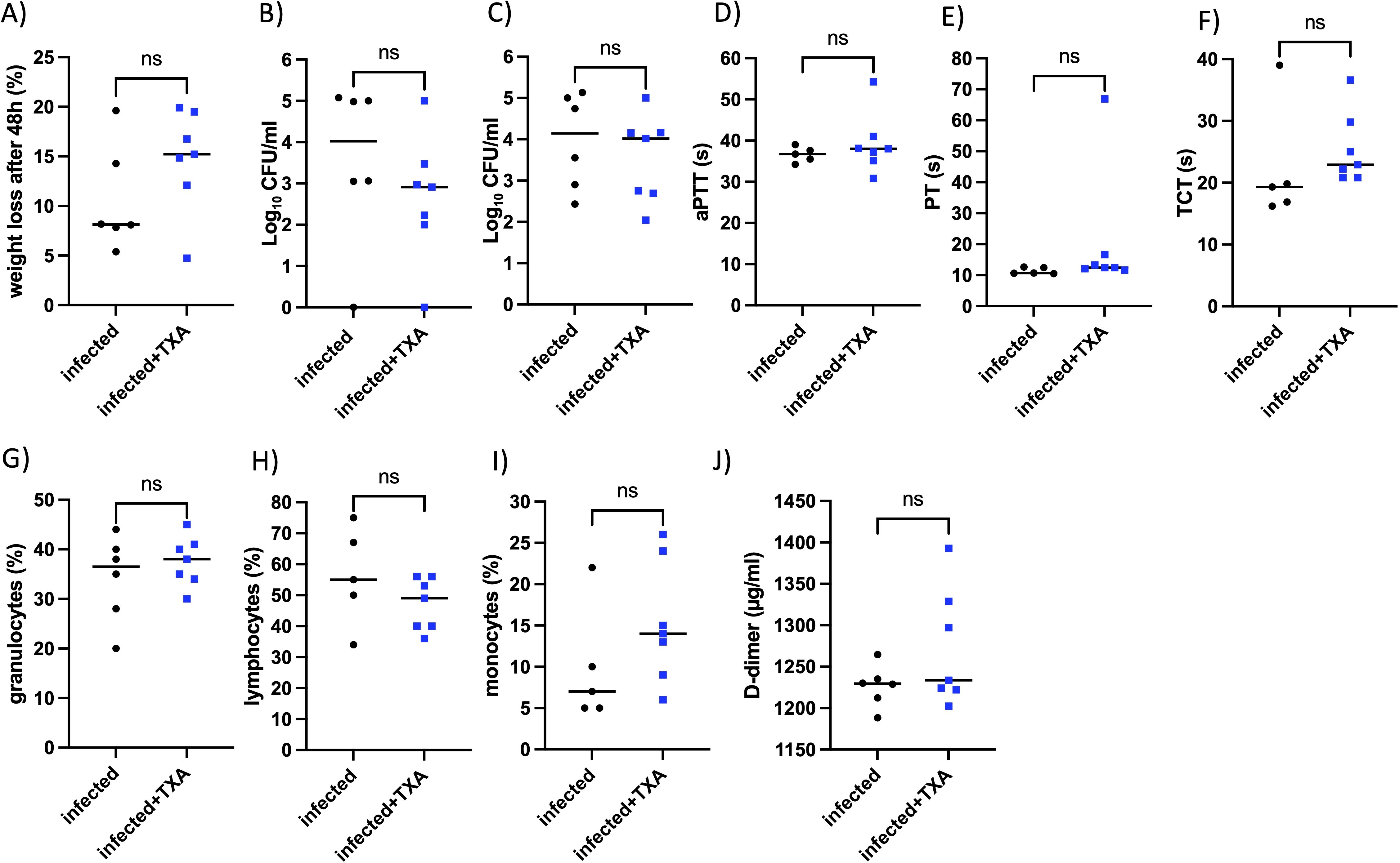 Figure 6. Intranasal TXA treatment does not affect bacterial numbers in lung and spleen, coagulation parameters, or immune cell profiles in vivo. AlbPlg1 mice (n=13) were infected intranasally with 1.5x108 CFU/mouse of Streptococcus pyogenes AP1. 4, 24 and 30 h after infection one group (n=7) were treated with TXA intranasally (200 µg/mouse, infected+TXA), and the other group (n=6, infected) recieved saline. 48 h after infection animals were released and blood and organs (lung and spleen) were collected. (A) Weight loss after infection. (B) CFU determined in right lung. (C) CFU determined in spleen. (D) aPTT (E) PT (F) TCT measured in plasma. Granulocytes (G), lymphocytes (H), and monocytes (I) were counted in blood smears. (J) D-dimers were determined in the homogenized left lung. The statistical differences were tested using t-test or Mann Whitney test.