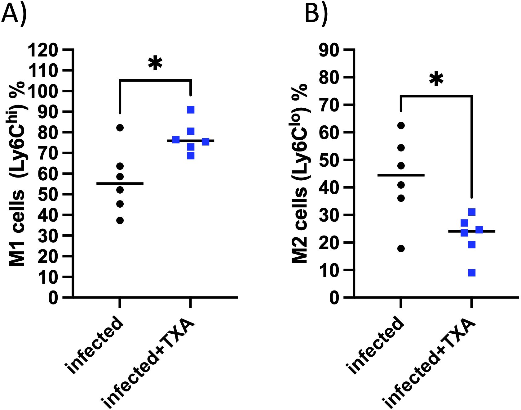 Figure 8. TXA treatment increases M1-like macrophages and reduces M2-like macrophages in the heart during GAS infection. Flow cytometric analysis of cardiac immune cell populations in AlbPLG1 mice 48 h after intranasal GAS infection and treatment with TXA (infected+TXA, n=6) or vehicle (infected, n=6). (A) proinflammatory M1-like macrophages, (B) anti-inflammatory M2-like macrophages, unpaired ttest, *p¾ 0.05.
