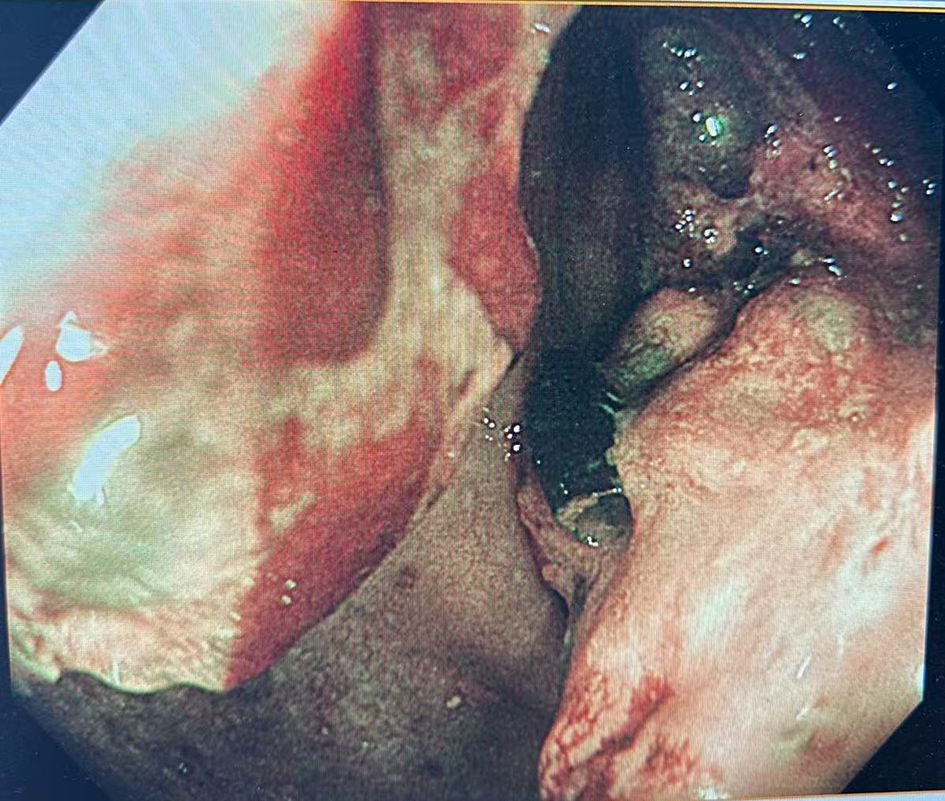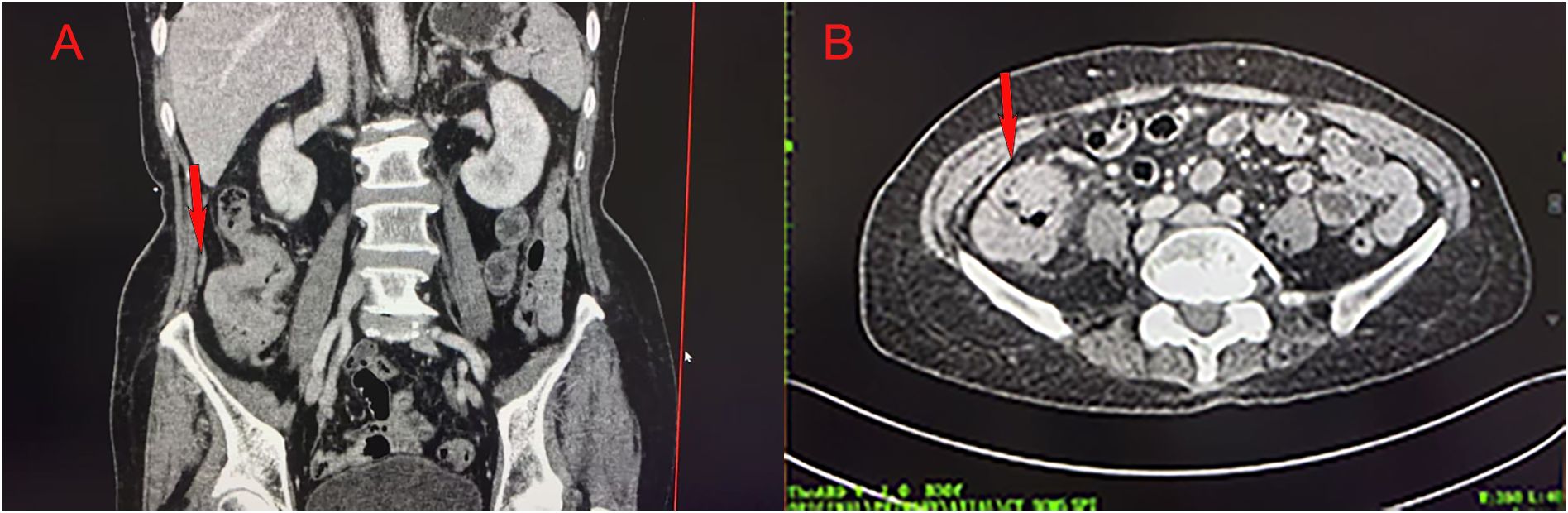 Colonoscopy demonstrated an ulcerative stricture in the ascending colon, and histopathological examination of the biopsy confirmed poorly differentiated adenocarcinoma (Figure 1). Imaging studies, including thoracoabdominal computed tomography (CT), revealed an ascending colon mass with mildly enlarged regional lymph nodes (Figure 2). The patient had no significant comorbidities, and preoperative cardiopulmonary evaluation confirmed suitability for surgery.