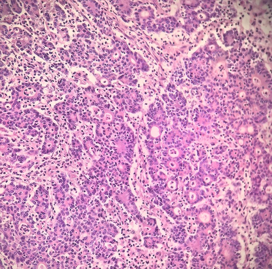 Figure 3. Postoperative pathology showing hepatoid adenocarcinoma differentiation with poor differentiation (Hematoxylin–eosin staining, ×200).