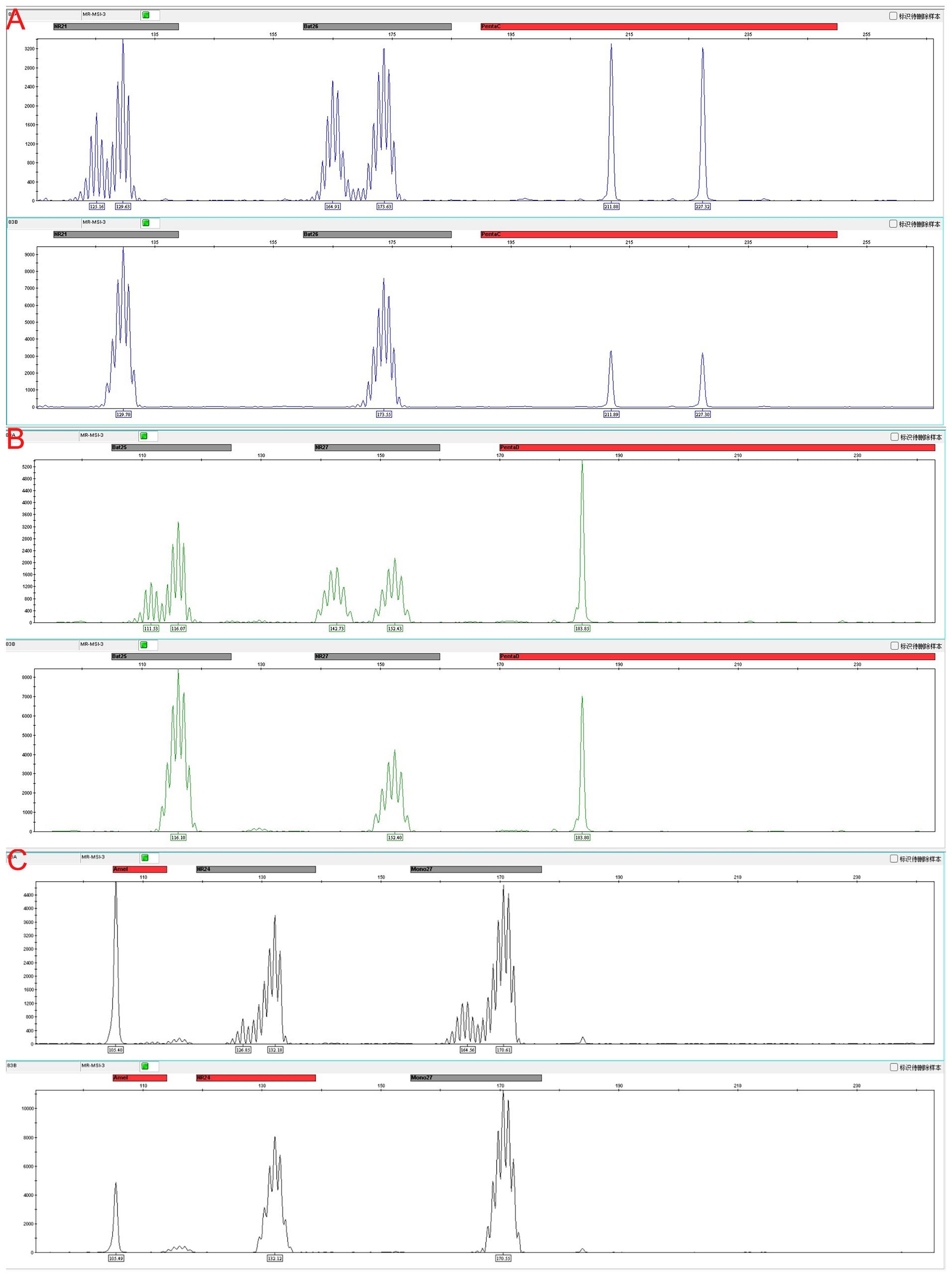 Figure 4. Microsatellite instability (MSI) analysis at six loci with matched tumor, adjacent non-tumor tissue, and peripheral blood DNA as controls. (A) Instability detected at BAT-26 and NR-21 loci. (B) Instability detected at BAT-25 and NR-27 loci. (C) Instability detected at NR-24 and MONO-27 loci. Representative electropherograms show allele shifts in tumor samples compared with stable patterns in adjacent non-tumor tissue and peripheral blood, confirming MSI-high status.