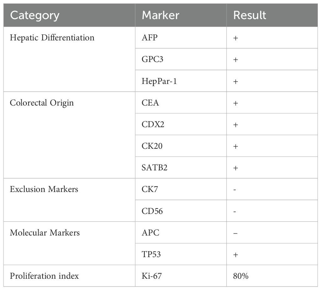 Hepatoid adenocarcinoma (HAC) is a rare and highly aggressive extrahepatic adenocarcinoma, first reported in a gastric tumor (10). HAC frequently presents with elevated serum AFP and characteristic hepatocellular morphology, and is associated with poor prognosis. It commonly expresses hepatocellular markers such as AFP, HepPar-1, and GPC3 (11). Colorectal-specific markers, including CDX2, CK20, and SATB2, help confirm the primary origin, distinguishing HAC from metastatic hepatocellular carcinoma or other malignancies. In this case, immunohistochemistry and molecular profiling confirmed both hepatoid differentiation and colorectal origin.