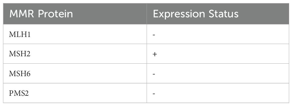MSI-H/dMMR CRC is characterized by high tumor mutational burden (TMB) and abundant neoantigen expression, often accompanied by increased tumor-infiltrating lymphocytes (TILs) and upregulation of immune checkpoint molecules, which collectively enhance sensitivity to immune checkpoint inhibitors (ICIs) (12, 13). Large clinical trials such as KEYNOTE-177 and CheckMate-142 have demonstrated significant and durable responses to PD-1 blockade in metastatic MSI-H/dMMR CRC, now recommended as first-line therapy in international guidelines (4, 14). In this patient, immunohistochemistry revealed intact MSH2 expression but loss of MLH1, MSH6, and PMS2, indicating that the dMMR phenotype was primarily related to the MLH1/PMS2 axis. MLH1 and PMS2 form a stable heterodimer essential for DNA mismatch repair; loss of MLH1 typically results in concurrent PMS2 deficiency. This pattern usually reflects somatic MLH1 mutations or promoter hypermethylation rather than hereditary MMR deficiency (15, 16).