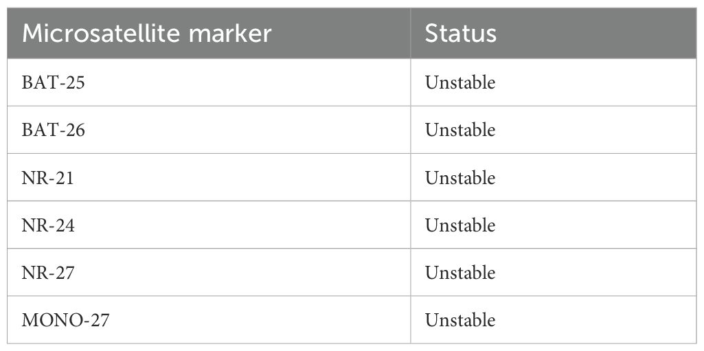 Immunohistochemistry revealed loss of mismatch repair (MMR) proteins MLH1, MSH6, and PMS2, with retained expression of MSH2, consistent with dMMR status (Table 2). Multiplex fluorescent PCR followed by capillary electrophoresis of six microsatellite loci (BAT-25, BAT-26, NR-21, NR-24, NR-27, MONO-27) (Figure 4)demonstrated instability at all sites, confirming MSI-H status (Table 3).