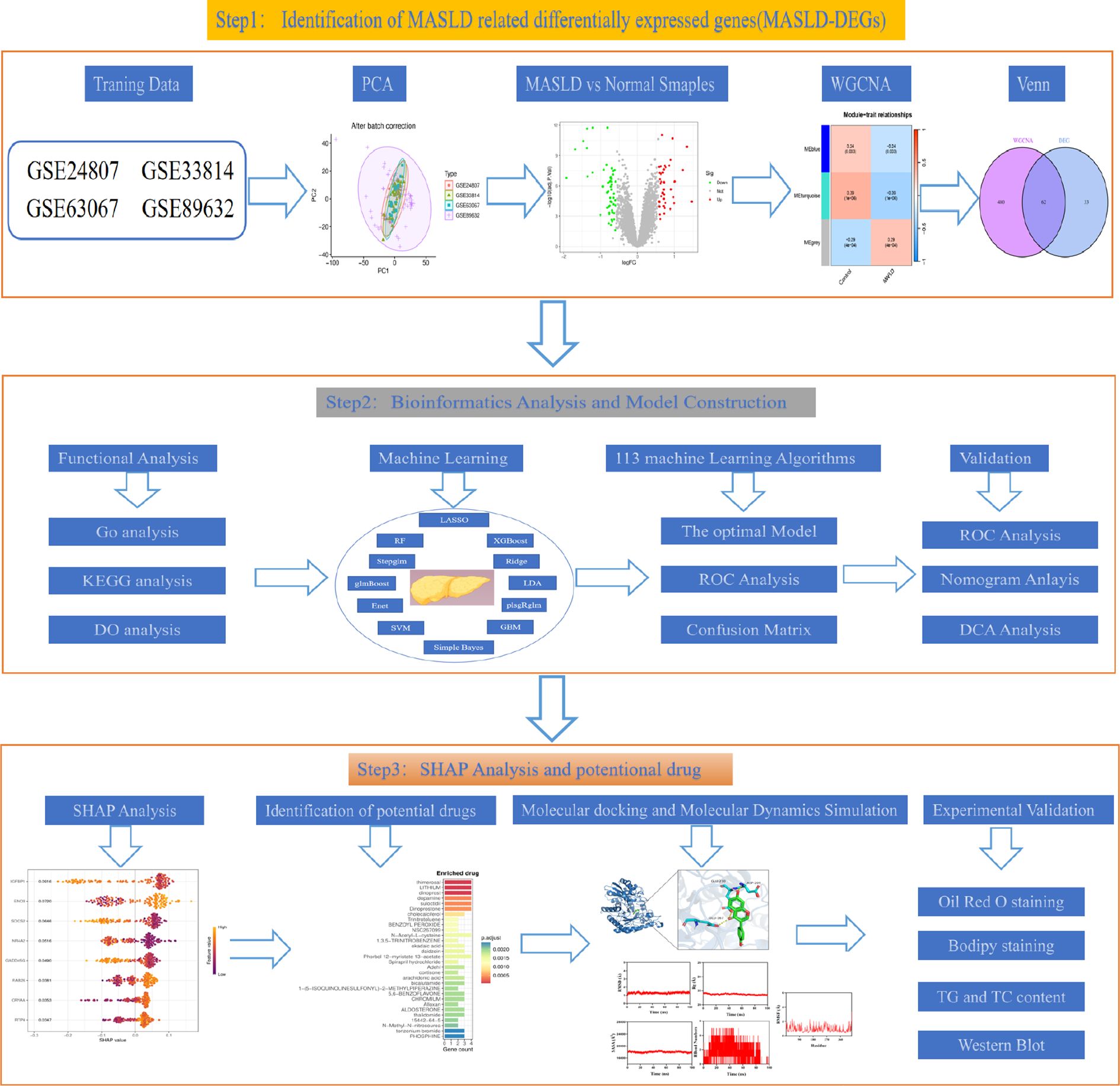 Flowchart illustrating a multi-step process for MASLD-related gene analysis and drug identification. Step 1: Identification of differentially expressed genes using data sets and PCA, followed by WGCNA and Venn analysis. Step 2: Bioinformatics analysis and model construction involve functional analysis, machine learning with various algorithms, and model validation through ROC and other analyses. Step 3: SHAP analysis identifies potential drugs, followed by molecular docking, simulation, and experimental validation through staining and content analysis.