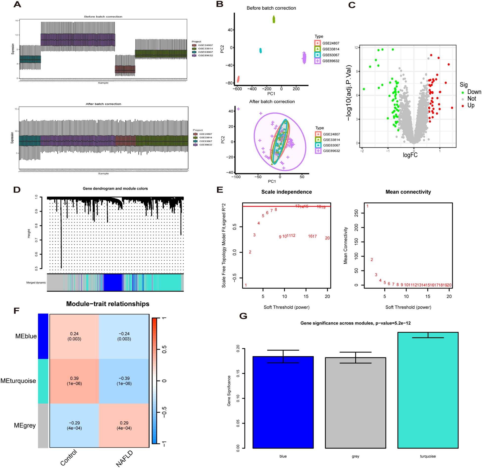 Data visualization summarizing gene expression analysis in multiple panels. Panel A shows sample distributions before and after batch correction. Panel B presents PCA plots before and after correction. Panel C illustrates a volcano plot of gene significance. Panel D includes a gene dendrogram with module colors. Panel E displays scale independence and mean connectivity plots for soft thresholding. Panel F features a heatmap of module-trait relationships, and Panel G shows a bar graph of gene significance across modules with different colors representing blue, grey, and turquoise.