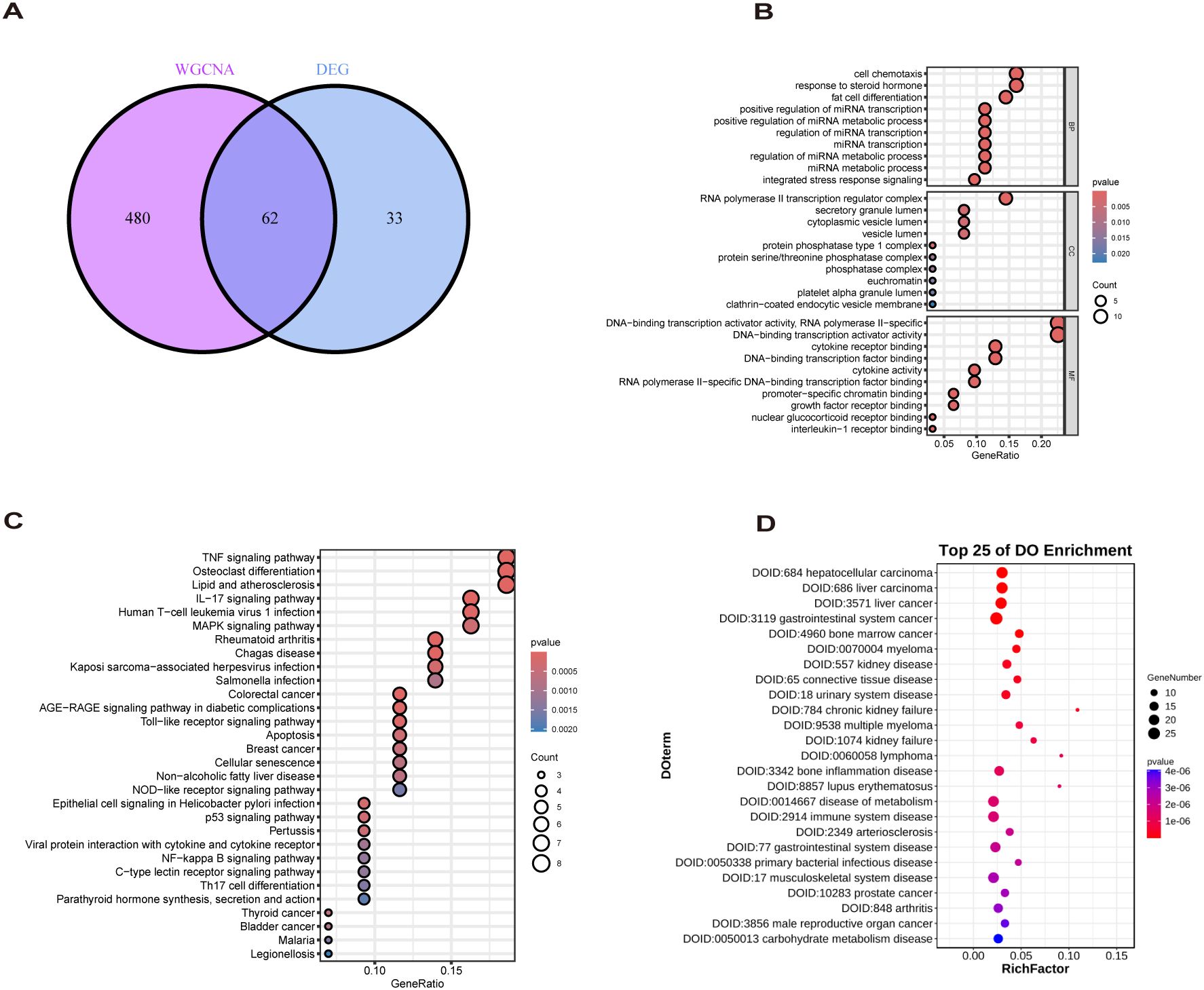 A set of four panels display Venn and bubble charts for gene and disease ontology analysis. Panel A shows a Venn diagram comparing WGCNA and DEG gene sets, highlighting 62 overlapping genes. Panels B and C present bubble charts of enriched gene pathways with gene ratios and p-values, showing various cellular processes and diseases. Panel D illustrates the top 25 disease ontology enrichments with gene numbers, focusing on various cancers and diseases with respective RichFactors.
