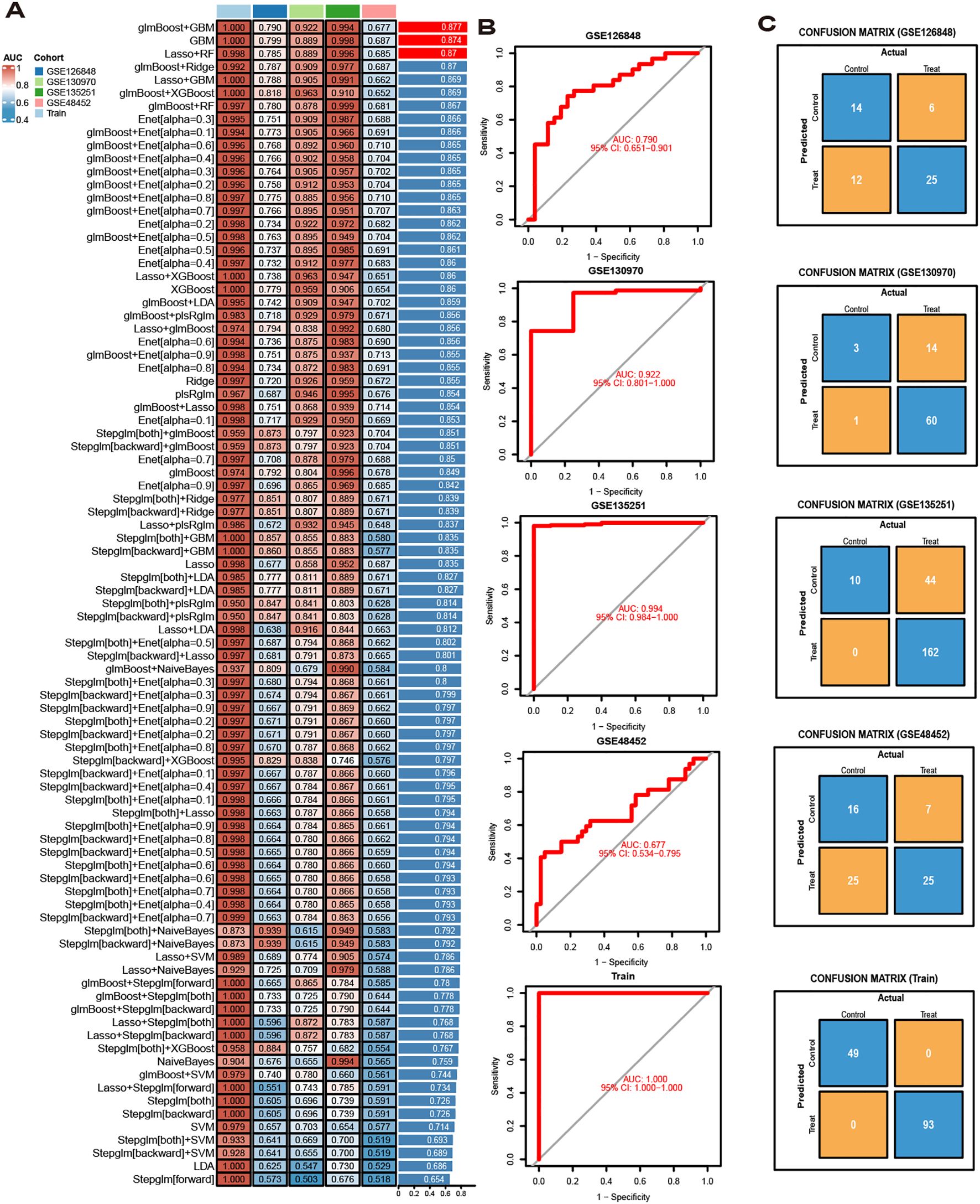 Data visualization with three sections. Section A shows a heatmap of AUC scores for different models across datasets. Section B presents ROC curves for four datasets (GSE126848, GSE130970, GSE135261, and GSE484652) with respective AUC values noted. Section C includes confusion matrices for each dataset, indicating true and predicted classifications of control and treatment groups.