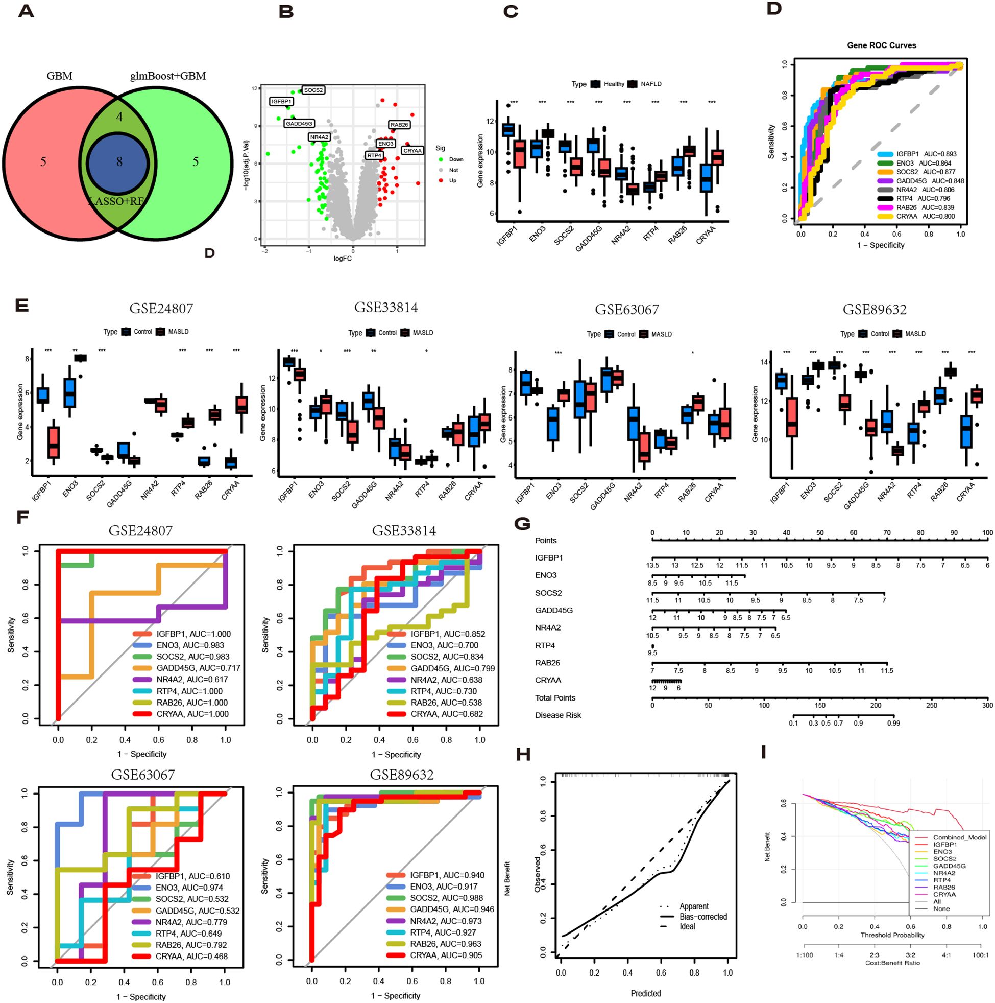Figure 5. Diagnostic value of eight genes in the optimal model. (A) The intersection of the top three machine learning algorithms ranked by average AUC. (B) Volcano plot showing the upregulation and downregulation of eight genes. (C) The box plot shows the expression of eight genes in the normal group and the MASLD group. (D) ROC curves for eight genes. (E) Expression levels of 8 genes in different MASLD datasets. (F) ROC curves for eight genes in different MASLD datasets. (G) Nomogram based on 8 genes. (H) Decision curve analysis (DCA) curve. (I) Diagnostic models and 8 genes in clinical decision-making (Net Benefit).