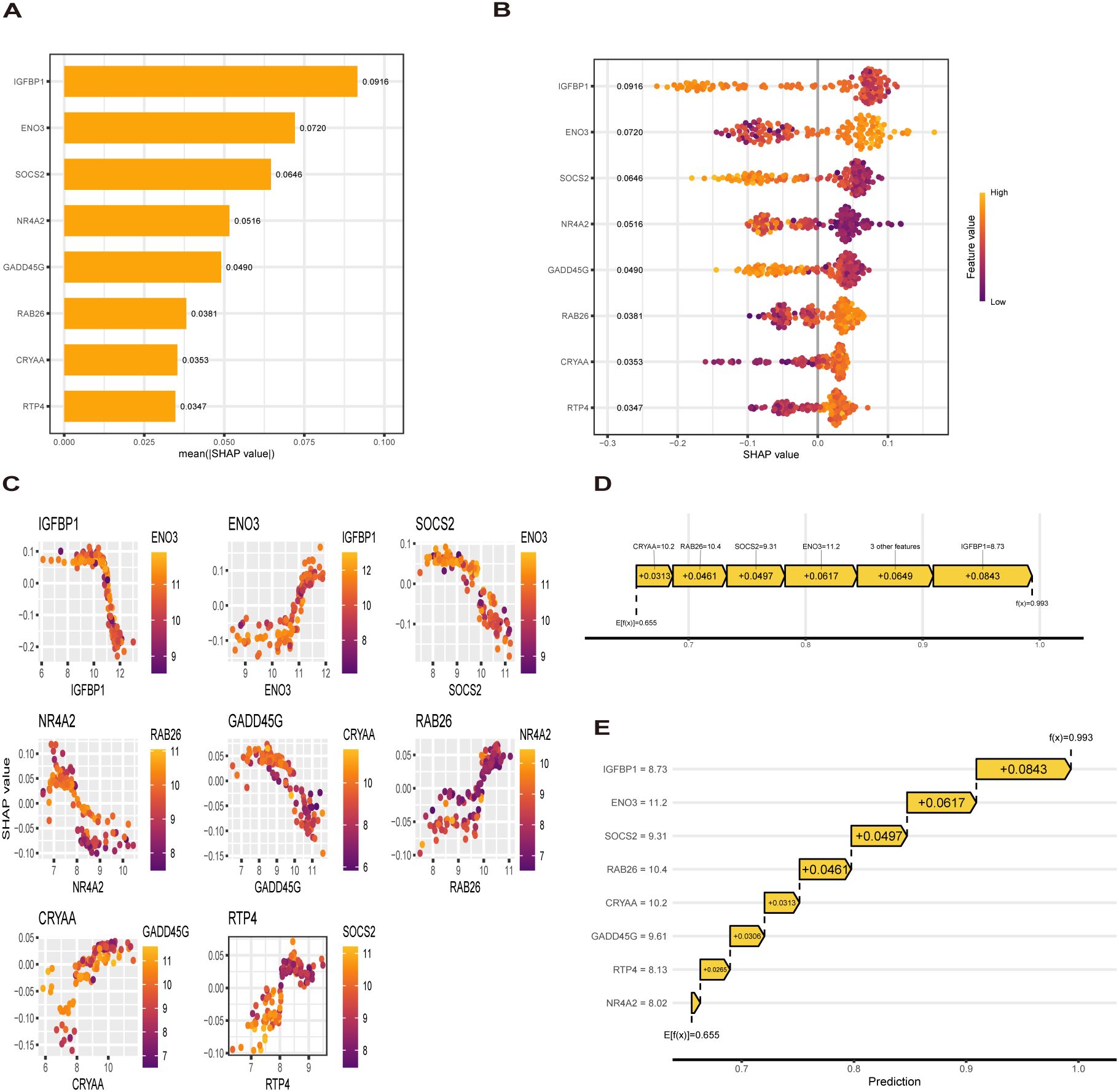 Diagram with multiple panels illustrating SHAP analysis. Panel A is a bar chart showing mean SHAP values for various genes, with IGFBP1 having the highest value. Panel B is a dot plot depicting SHAP values for individual samples, colored by feature value. Panel C shows scatter plots of SHAP values against gene values for different genes. Panel D is a flow diagram demonstrating cumulative SHAP contributions toward a prediction score. Panel E is a waterfall plot showing individual SHAP contributions for each feature, leading to a final prediction value.