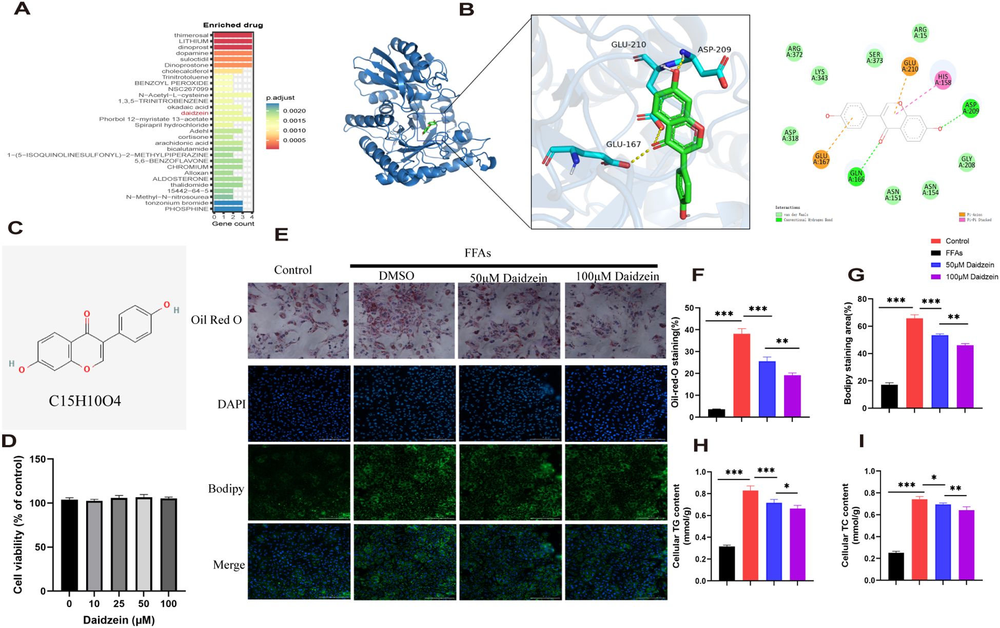 Diagram with multiple panels illustrating scientific data. Panel A shows a bar graph of enriched drugs, highlighting Daidzein. Panel B displays molecular interactions of Daidzein with proteins. Panel C depicts the chemical structure of Daidzein. Panel D is a bar graph of cell viability across Daidzein concentrations. Panel E presents microscopy images showing effects of Daidzein on cell staining under various conditions. Panels F to I show bar graphs of Oil Red O staining, Bodipy staining, and cellular triglyceride content, indicating statistical significance through asterisks, comparing the effects of different Daidzein concentrations.