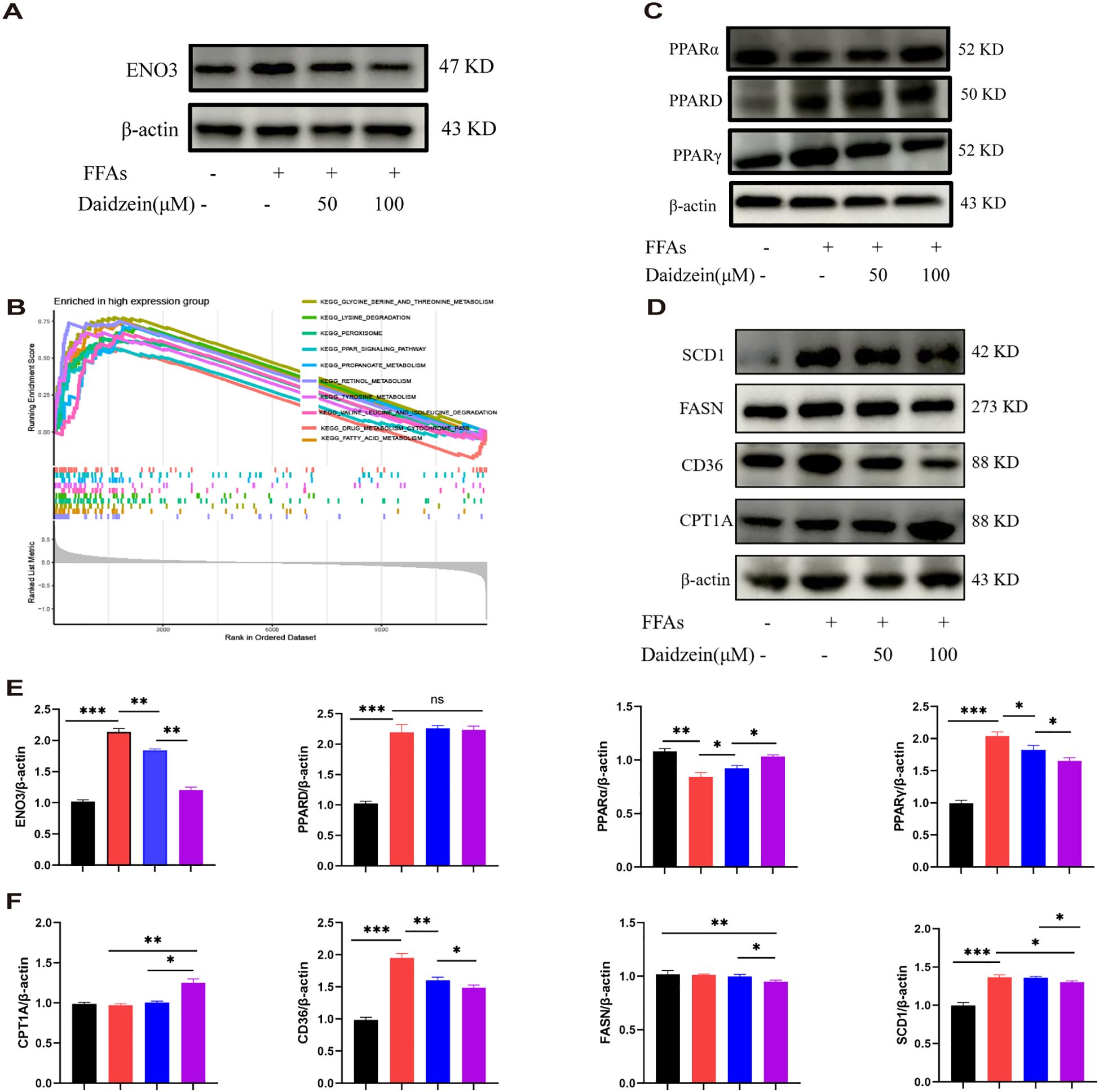 Figure 8. Daidzein alleviates MASLD through the ENO3/PPAR signaling pathway. (A) Daidzein reduced the protein expression of ENO3 in primary hepatocytes. (B) GSEA analysis shows the top 10 pathways with high ENO3 expression. (C) Daidzein affects the expression of 3 proteins, PPARα, PPARγ, and PPARD, in primary hepatocytes. (D) Daidzein affects the protein expression of downstream proteins (SCD1,FASN, CD36 and CPT1A) in the PPAR pathway. (E, F) Perform protein quantification analysis of ENO3, PPAR, PPARγ PPARD, CPT-1A, CD36, FASN and SCD1. The experiment was repeated three times. * P < 0.05, ** P < 0.01, *** P < 0.001.