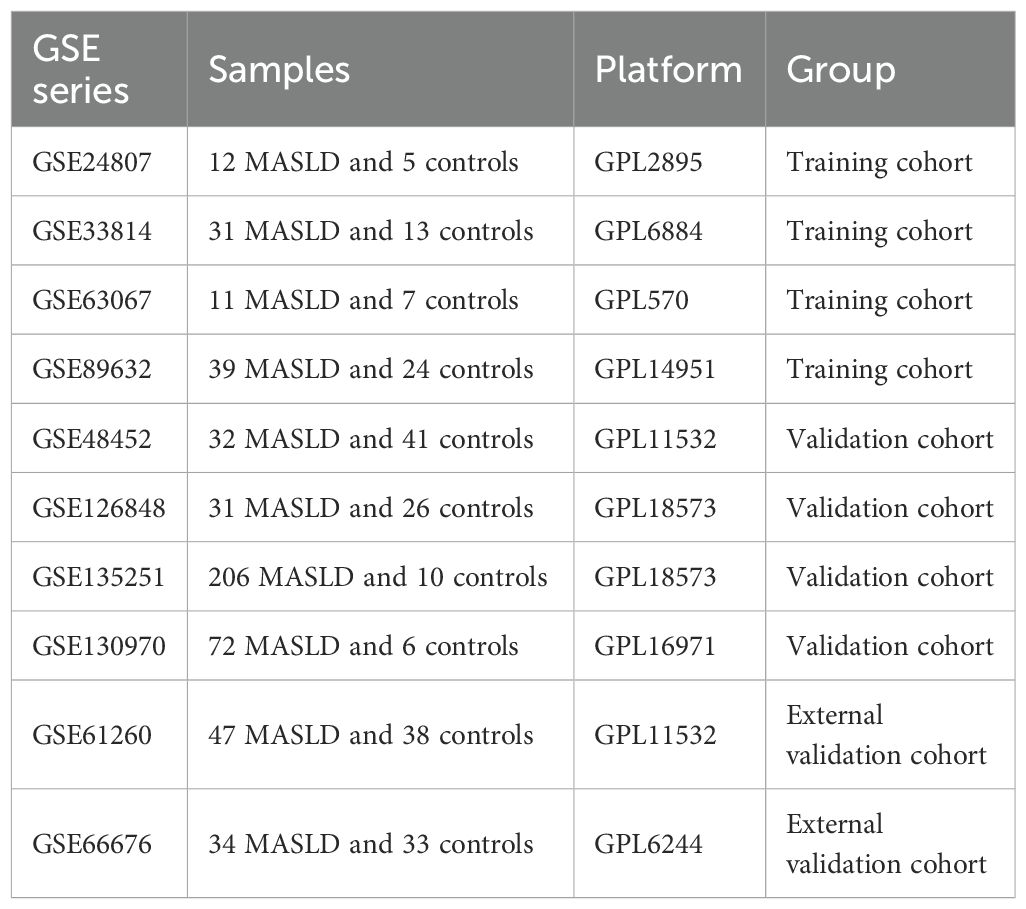 We analyzed transcriptomic data from 434 patients with MASLD and 132 healthy controls, sourced from 8 independent datasets in the Gene Expression Omnibus (GEO) database, including GSE24807,GSE33814, GSE63067, GSE89632, GSE48452, GSE66676, GSE126848, GSE130970 and GSE135251. The “combat” algorithm in the R package “sva” (13) was used to normalize and merge GSE24807,GSE63067, GSE89632 and GSE33814 into a training set and “normalizeBetweenArrays” algorithm from the “limma” package was utilized for data correction (14). GSE12684, GSE130970, GSE135251 and GSE48452 were 4 independent validation cohorts. GSE61260 and GSE66676 were used as external validation cohorts. Principal component analysis (PCA) and boxplots were further validated for quality control. Detailed information such as platform, samples and GSE series on these datasets is shown in Table 1.