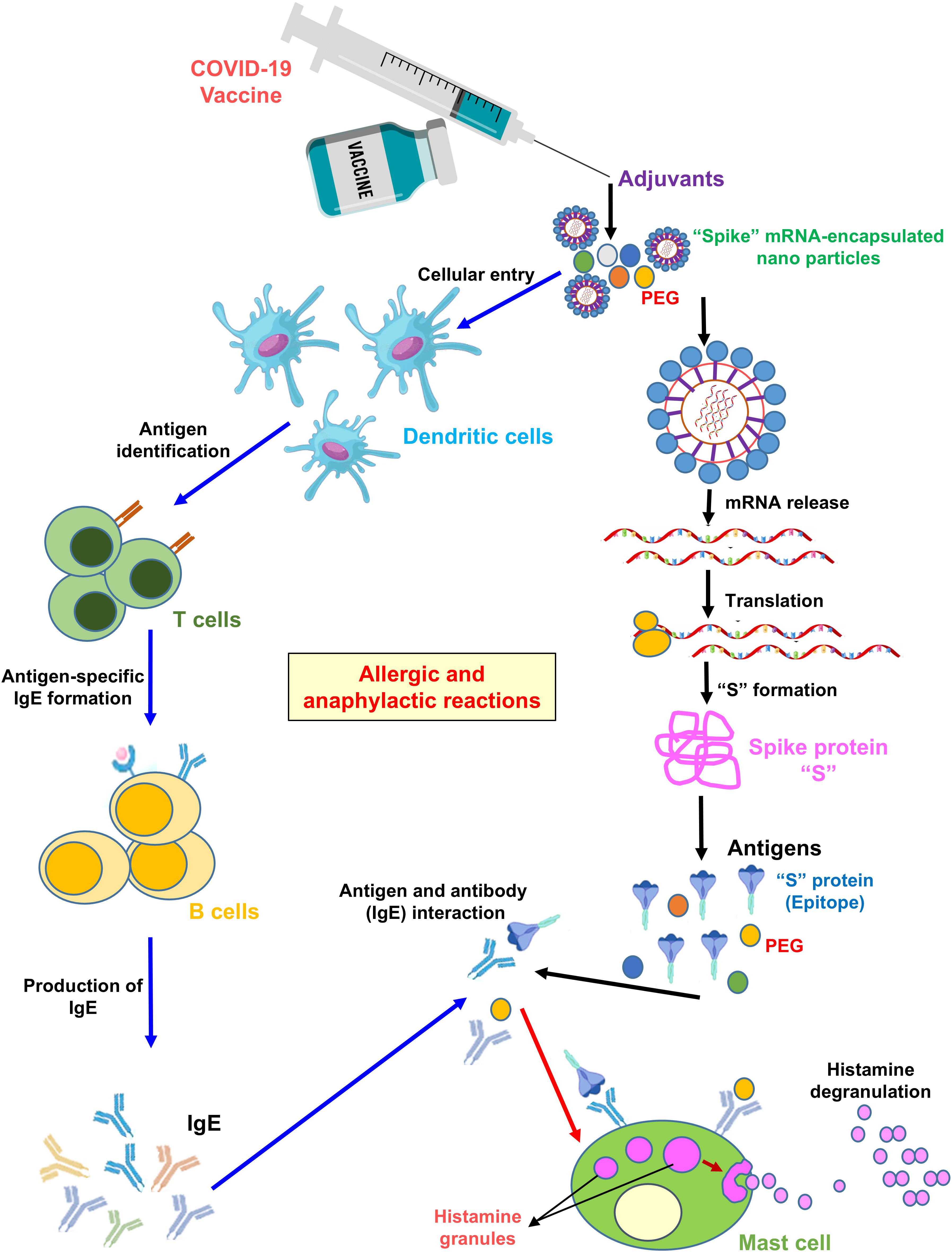 Figure 1. Mechanism of allergic and anaphylactic reactions following mRNA vaccination. As shown in the illustration, PEG nanoparticle packaging of the “S” protein mRNA enters an APC cell, such as dendritic cells, via endocytosis. The mRNA is then translated into the S protein by ribosomes. The APC presents free-floating PEG or S protein epitopes as antigens to T helper cells. The latter secrete cytokines, leading to B-cell activation. B cells produce IgE antibodies against PEG or S protein epitopes. Antigen-specific (PEG and S protein specific) IgE antibodies bind to the FcϵRI receptor. Engagement of this receptor triggers histamine release from basophils and/or mast cells, resulting in allergic/anaphylactic reactions.