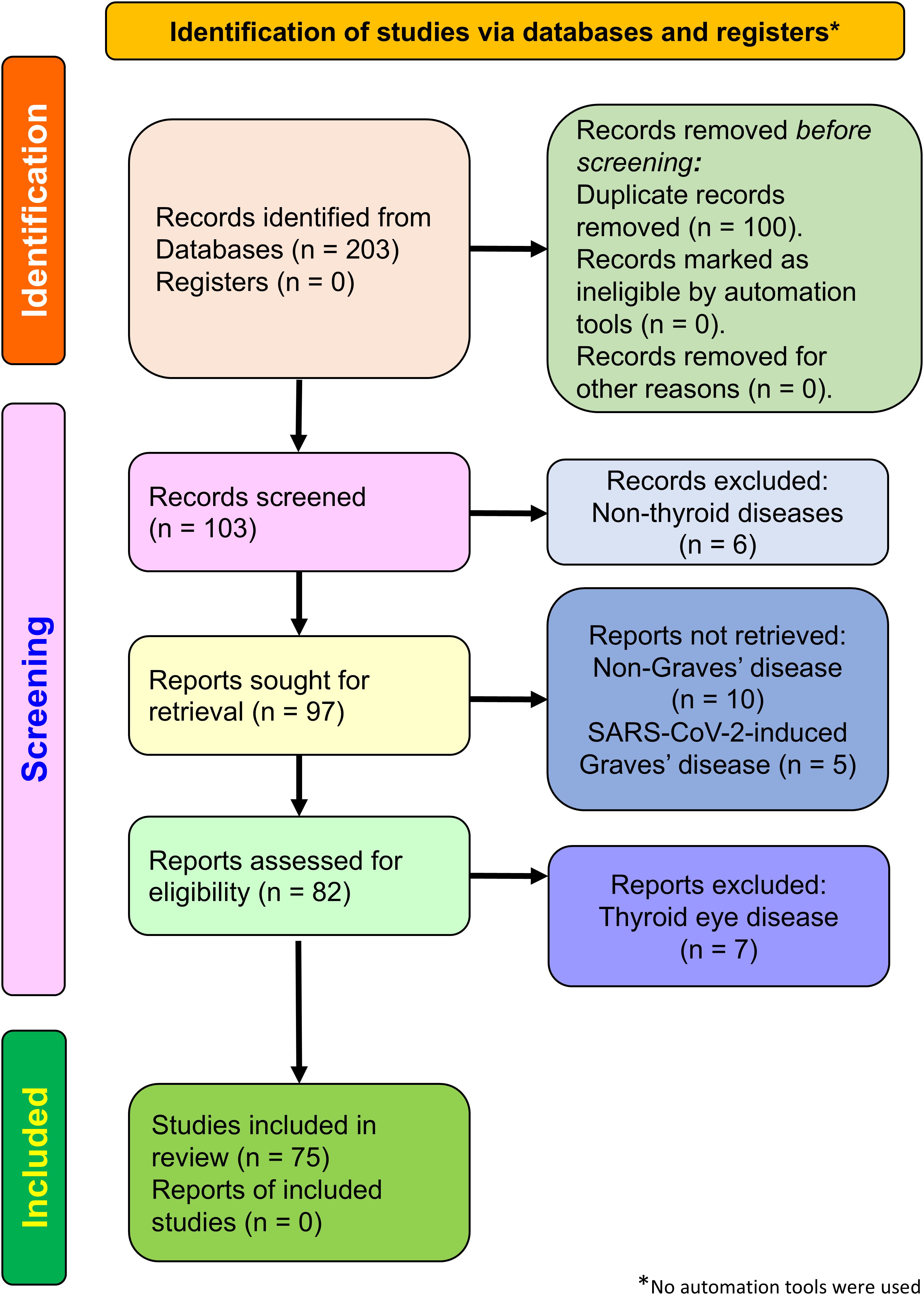 We comprehensively searched the literature in PubMed, Web of Science, SCOPUS, and Google Scholar databases. The search terms used were “SARS-CoV-2 vaccine, Graves’ disease”, “COVID-19 vaccine, Graves’ disease”, “hyperthyroidism, COVID-19 vaccine”, and “hyperthyroidism, SARS-CoV-2 vaccine”. Only articles published in English were included. All articles published on/or before 31 December 2024 were considered, regardless of type, including full-length articles, short reports, case reports, and letters to the editor. We excluded articles reporting nonthyroid disease, non-Graves’ disease, SARS-CoV-2-induced Graves’ disease, and thyroid eye disease (TED). In total, 203 articles were retrieved through the database search. Of these, 100 duplicates, six nonthyroid disease articles, 10 non-Graves’ disease articles, five SARS-CoV-2-induced Graves’ disease articles, and seven TED articles were removed. All details are summarized in the Preferred Reporting Items for Systematic Reviews and Meta-Analyses (PRISMA) flow chart (http://www.prisma-statement.org) in Figure 2.