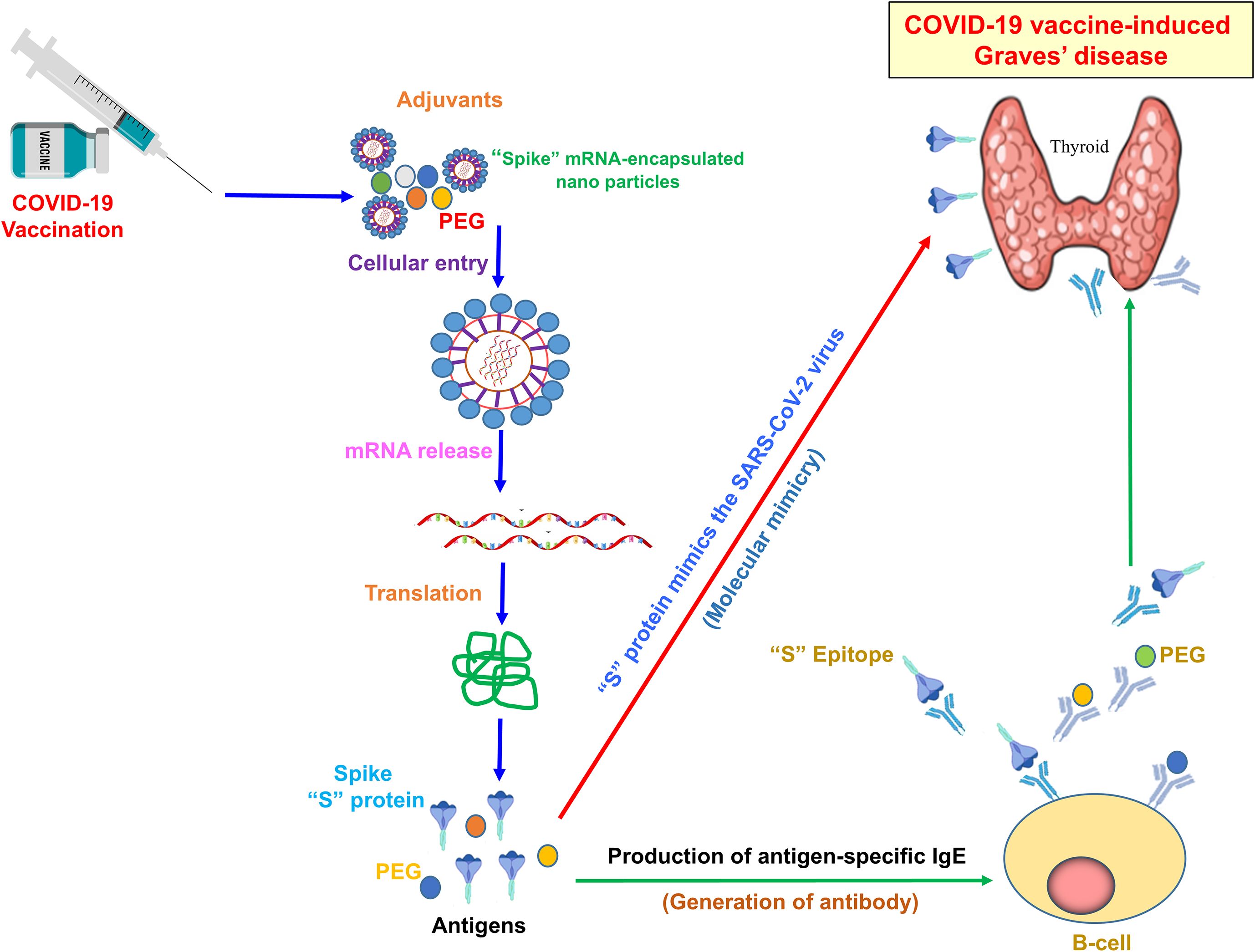 Figure 3. Mechanism of COVID-19 vaccine-induced Graves’ disease. The illustration typically shows how adjuvants and antigen-specific antibodies induce GD. The SARS-CoV-2 “S” protein mimics the viral antigen, triggering an immune response post-COVID-19 vaccination. Adjuvants, including PEG-encapsulated spike mRNA nanoparticles, enhance antigen delivery and immune activation. Upon mRNA release and translation, the “S” protein is expressed, leading to B-cell activation and the production of antigen-specific IgE antibodies. Molecular mimicry between the spike protein epitope and thyroid antigens may contribute to the development of autoimmune thyroid dysfunction, including GD.