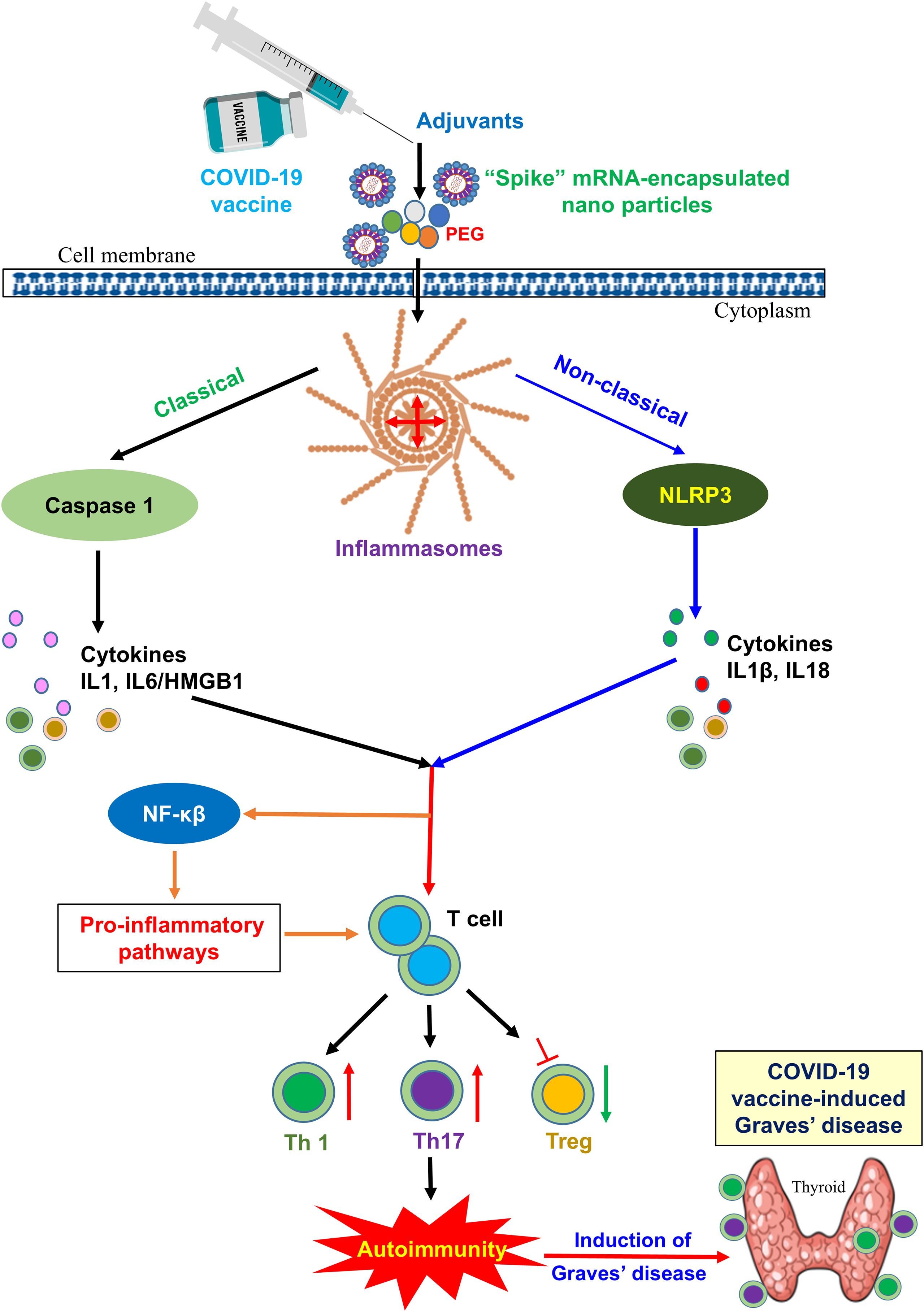 This refers to the involvement of inflammatory molecules in activating the immune system during the development of GD following COVID-19 vaccination. In typical GD, the immune system targets the thyroid gland, causing overactivity and excessive production of thyroid hormones. When a person receives a COVID-19 vaccine, their immune system is stimulated to generate a response against the virus. In some individuals, however, vaccination can also trigger inflammation—partly due to vaccine adjuvants—leading to the production of autoantibodies that target the thyroid gland (75, 89). These autoantibodies can stimulate the thyroid gland to produce excessive thyroid hormones, leading to hyperthyroidism and the clinical manifestations of GD (89).