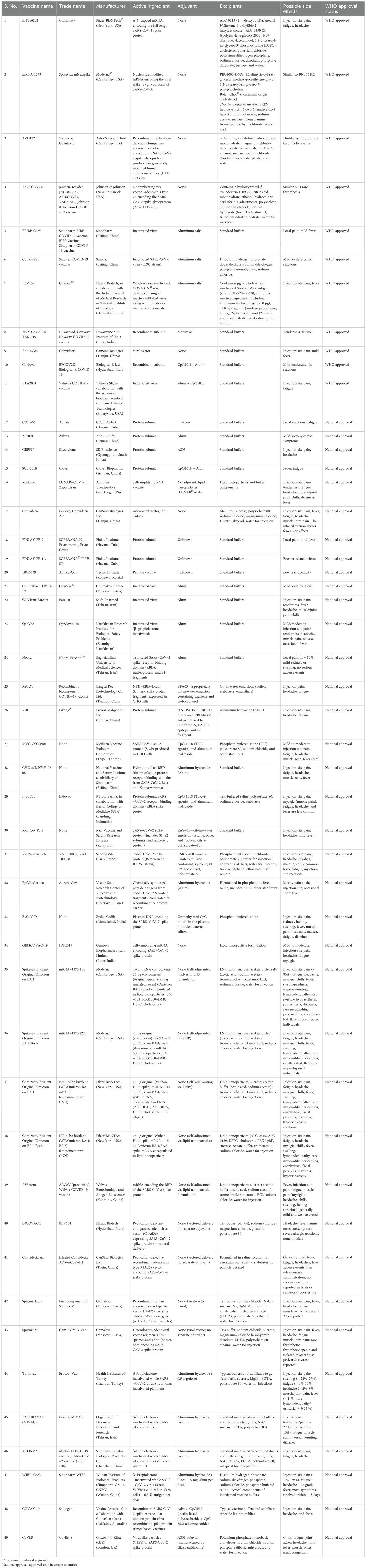 Chemical constituents and characteristics of various SARS-CoV-2 vaccines