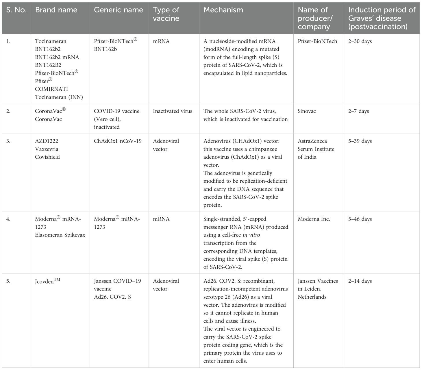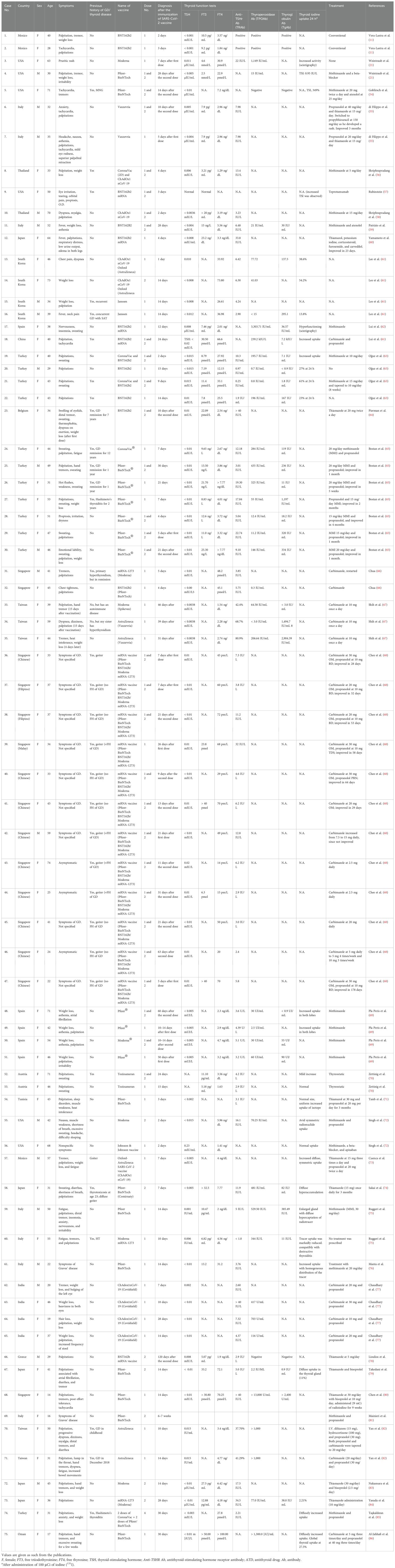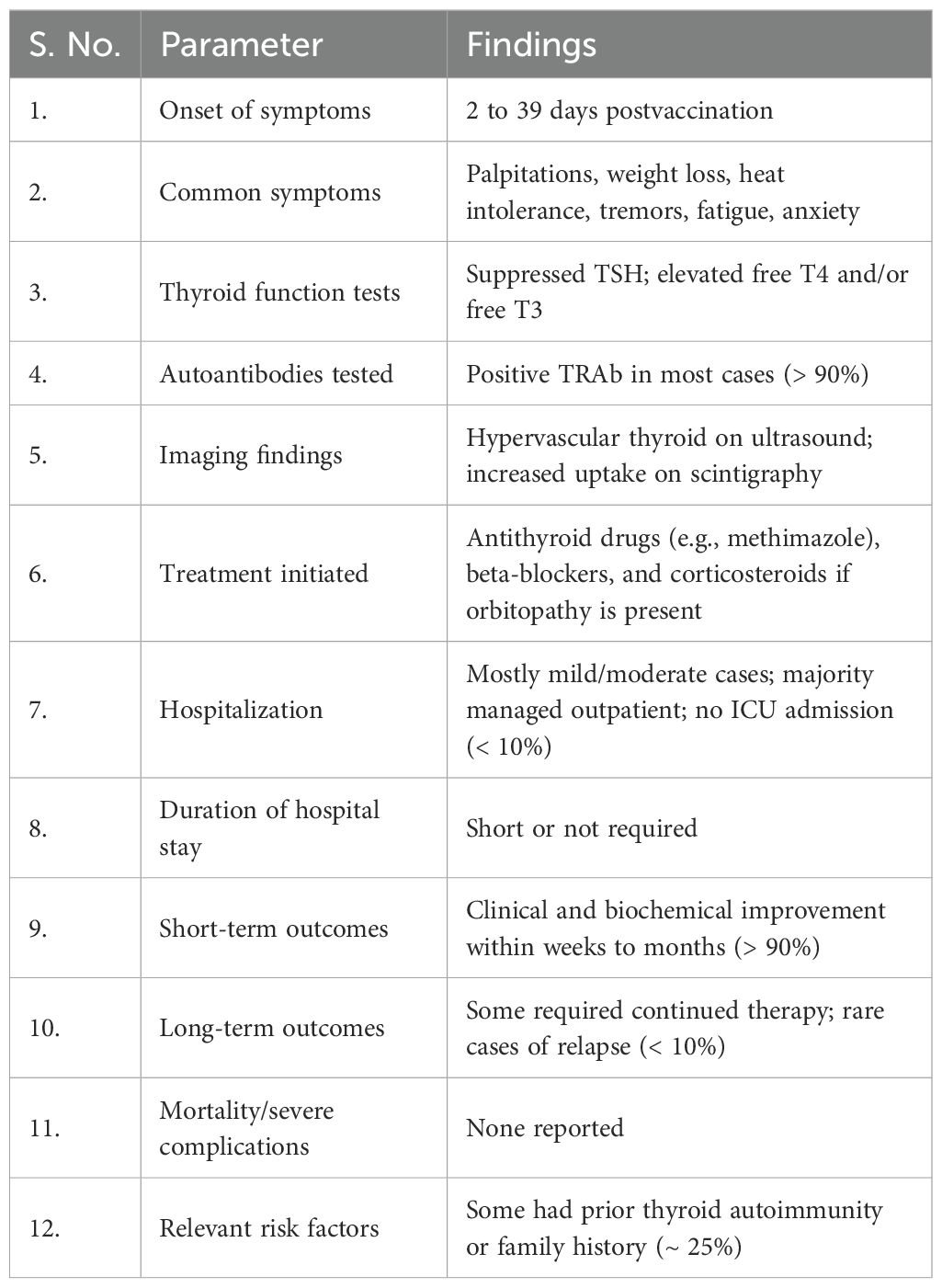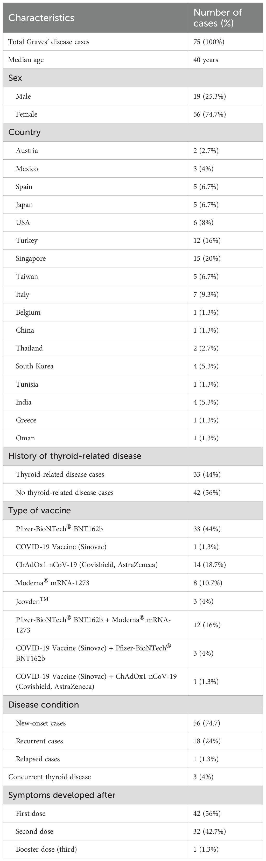 There have been many reports and studies suggesting a potential link between COVID-19 vaccination and the development of autoimmune conditions such as GD. As shown in Table 2, the induction period of GD in postvaccination varies depending on the vaccine type. Specifically, Pfizer-BioNTech® ranges from 2 to 30 days, CoronaVac® from 2 to 7 days, ChAdOx1 nCoV-19 from 5 to 46 days, and Jcovden™ from 2 to 14 days. To date, and as listed in Table 3, a total of 75 cases of vaccine-induced GD have been reported, and the detailed characteristics of each case are documented as described in the respective original articles (11, 21, 54–86). The characteristics of SARS-CoV-2 vaccine-induced GD are summarized in Table 4. The median age of affected individuals is 40 years, indicating a predilection for middle-aged adults. Out of 75 cases, 56 were women (74.7%) and 19 were men (25.3%), supporting the known female predominance in autoimmune diseases. Cases were reported globally, with the highest numbers from Singapore (15 cases), followed by Turkey (12 cases), Italy (seven cases), and the USA (six cases). These numbers may reflect the intensity of vaccination campaigns or genetic/environmental predispositions in specific populations. In total, 33 cases (44%) had a preexisting thyroid condition, such as autoimmune thyroiditis or GD in remission, whereas 42 cases (56%) had no prior thyroid-related diseases. Vaccine-associated GD occurred both with individual vaccines and through combinations of different vaccines (heterologous vaccination). The Pfizer-BioNTech® BNT162b vaccine was the most frequently associated, inducing GD in 33 cases (44%), followed by ChAdOx1 nCoV-19 (Covishield, AstraZeneca) in 14 cases (18.7%), and Moderna® mRNA-1273 in eight cases (10.7%). The remaining cases were linked to combinations such as Pfizer + Moderna or Sinovac with other vaccines, highlighting the effects of heterologous vaccination. Among them, 56 cases (74.7%) were new-onset, emphasizing that vaccine-induced GD is not restricted to individuals with prior thyroid disorders. This finding demonstrates the immune-activating potential of vaccines in triggering autoimmunity in some previously healthy individuals. Recurrent GD cases accounted for 18 cases (24%), representing a recurrence in those with resolved or remitted GD. Relapsed GD was identified in only one case (1.3%) involving individuals with ongoing thyroid dysfunction. Only three cases had documented concurrent thyroid diseases, such as Hashimoto’s thyroiditis, indicating that thyroid dysfunction postvaccination may primarily arise as a new autoimmune phenomenon. Onset and symptom timing were reported after the first dose in 42 cases (56%), after the second dose in 32 cases (42.7%), and after a booster dose in only one case (1.3%). This suggests a higher likelihood of onset during initial vaccine exposure, possibly due to immune priming. Major limitations of this observation include potential underreporting of cases due to mild symptoms or lack of awareness. Variations in case definitions, diagnostic criteria, and follow-up durations across studies may also influence the reported prevalence. Table 3 highlights the predominance of new-onset GD cases, female susceptibility, and a strong association with mRNA vaccines (Pfizer-BioNTech). It also emphasizes the importance of postvaccine surveillance and patient education for timely diagnosis and management, and suggests future research directions, such as investigating genetic predispositions and mechanisms of vaccine-induced thyroid autoimmunity. Tables 3, 4 systematically synthesize and critically appraise the currently dispersed case reports, providing a comprehensive overview of this emerging phenomenon and highlighting potential future research directions, such as investigating genetic predispositions and mechanisms of vaccine-induced thyroid autoimmunity. Table 5 details the hospital course and outcomes of COVID-19 vaccine-induced Graves’ disease. Symptom onset ranged from 2 to 39 days after vaccination, with common clinical features including palpitations, weight loss, heat intolerance, tremors, fatigue, and anxiety—typical manifestations of hyperthyroidism. Thyroid function tests typically revealed suppressed TSH levels with elevated free T4 and/or free T3, and over 90% of patients tested positive for TRAb, confirming the autoimmune nature of the condition. Imaging studies often showed a hypervascular thyroid on ultrasound and increased uptake on scintigraphy, consistent with active Graves’ disease. Treatment primarily involved antithyroid medications such as methimazole and beta-blockers, with corticosteroids reserved for cases with eye involvement. Most patients experienced mild to moderate illness, managed on an outpatient basis, with minimal hospitalization and no ICU admissions. The short-term outlook was favorable, with over 90% of patients demonstrating clinical and biochemical improvement within weeks to months. Long-term follow-up indicated that a minority required ongoing therapy or experienced relapse, although such instances were uncommon. Importantly, no cases of mortality or severe complications were reported. Approximately 25% of individuals had a personal or family history of thyroid autoimmunity, suggesting a potential predisposition.