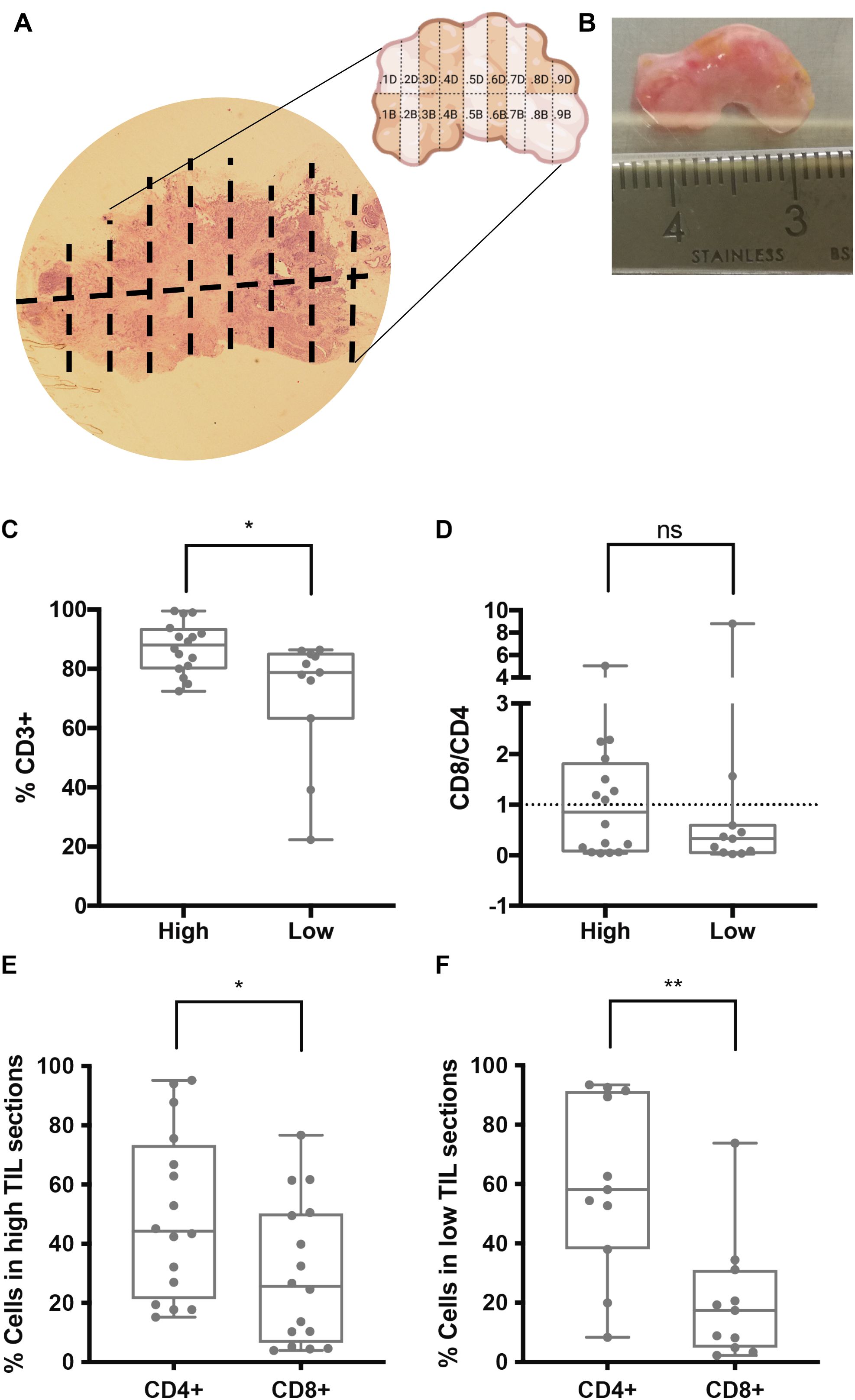 Figure 1. Association between IHC TIL infiltration and TIL populations in early explant cultures of tumor biopsies. (A, B) Representative biopsy (Q1) analyzed by IHC for CD3 to determine TIL infiltration. The IHC image (A) corresponds to the mirror of the biopsy, which was sectioned into multiple parts, some of which were cultured as early explants. The physical tumor tissue sample is shown in (B). IHC results were used to categorize cultured sections as “high” or “low” TIL infiltration. (C–F) Percentages of T cell populations measured by flow cytometry in early explant cultures derived from sections classified as “high” or “low” TILs. (C) CD3+ T cells were significantly higher in cultures from “high TILs” sections (*p < 0.05). (D) CD8/CD4 ratio, (E, F) a significantly higher CD4+ versus CD8+ percentage was observed in both high (E) and low (F) TIL sections (*p< 0.05 and **p< 0.01, respectively). ns, not significant.