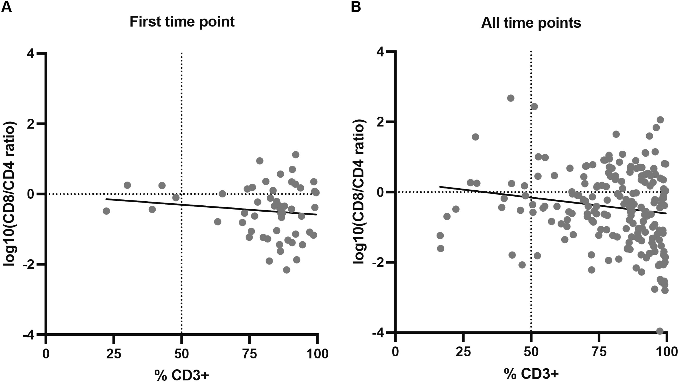 Figure 2. Correlation between percentages of CD3+ T cells and log10-transformed CD8/CD4 ratios in early explant cultures. (A) First timepoint of each explant culture (N = 53); no significant correlation was observed (Spearman r = -0.06, p-value (two-tailed) = 0.672), although a slight trend toward lower CD8/CD4 ratios with increasing CD3+ percentages is noted. (B) All timepoints combined (N = 192); a weak but significant negative correlation was detected (Spearman r = -0.169, p-value (two-tailed) = 0.019). Individual values for each biopsy-fragment and timepoint are shown in Supplementary Figure 1.