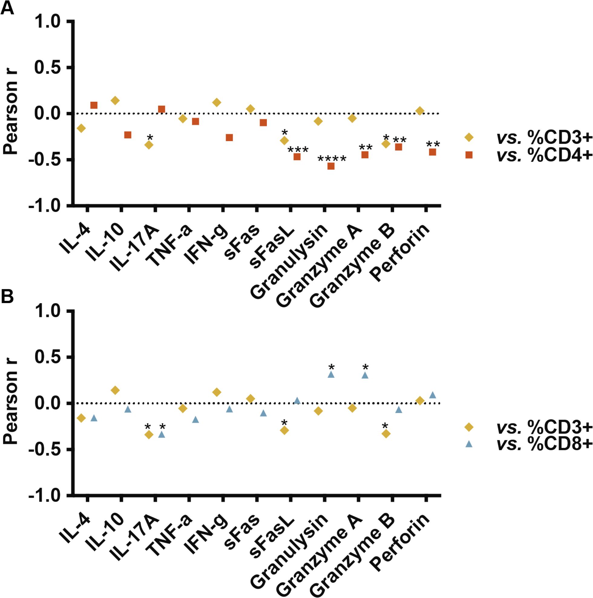 Figure 3. Pearson correlations between percentages of CD3+, CD4+ and CD8+ TILs and concentration (pg/ml) of soluble molecules in culture supernatants. CD4+ T cell percentages inversely correlated with certain cytotoxic molecules (sFasL, granulysin, granzyme A, granzyme B, and perforin; p = 0.0006, p < 0.0001, p = 0.0012, p = 0.0098, and p = 0.0026, respectively). CD3+ TILs also exhibited an inverse correlation with sFasL (p = 0.039) and granzyme B (p = 0.02). CD8+ percentages positively correlated with granulysin and granzyme A (p = 0.025 and p = 0.029, respectively). A significant inverse relationship with the production of IL-17A was observed both with the percentages of CD3+ (p = 0.017) and CD8+ T cells (p = 0.018). Individual cytokine values and dotplots for each population are provided in Supplementary Table 1 and Supplementary Figures 2-5.