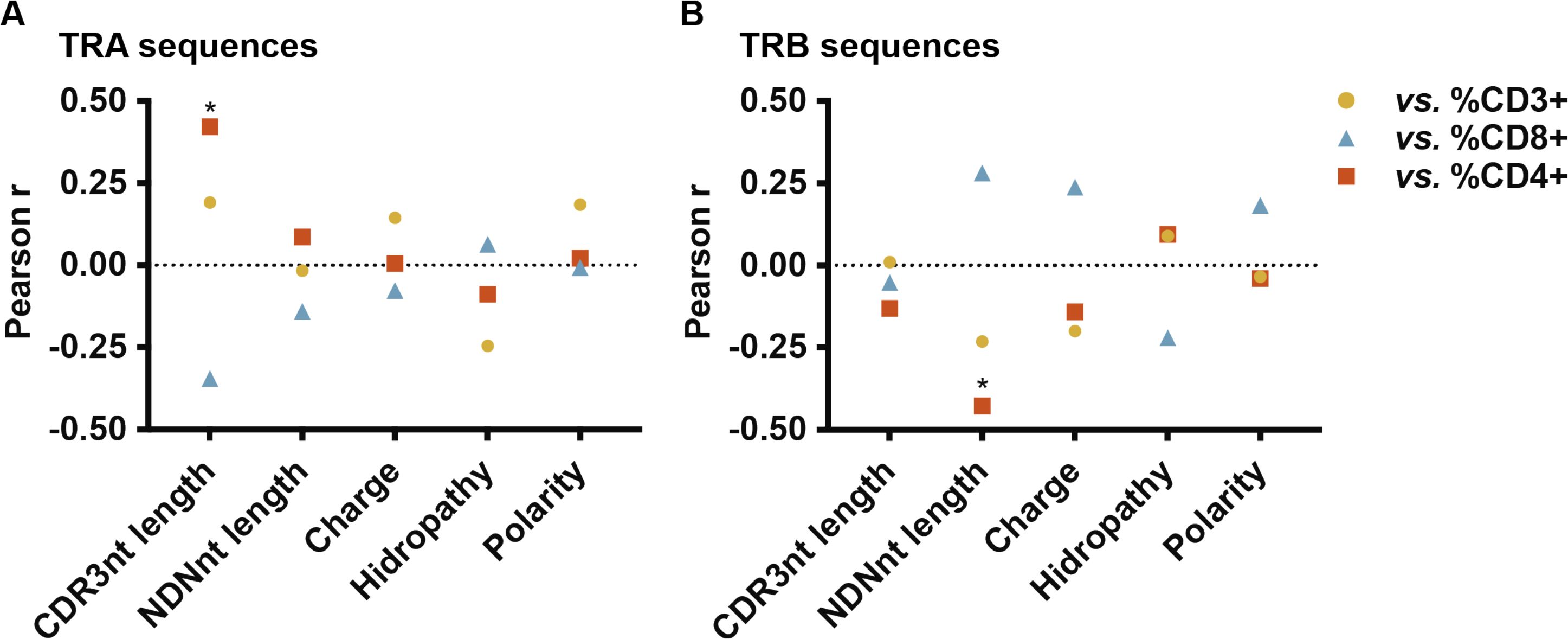 Figure 4. Pearson correlations between TCR sequence properties and CD3+, CD4+ and CD8+ percentages in minimally cultured TILs. (A) TRA CDR3 nt length positively correlated with CD4+ T cell percentage (p = 0.03). (B) TRB N(D)N nt length negatively correlated with CD4+ T cell percentage (p = 0.03). Individual data points are shown in Supplementary Figure 7.
