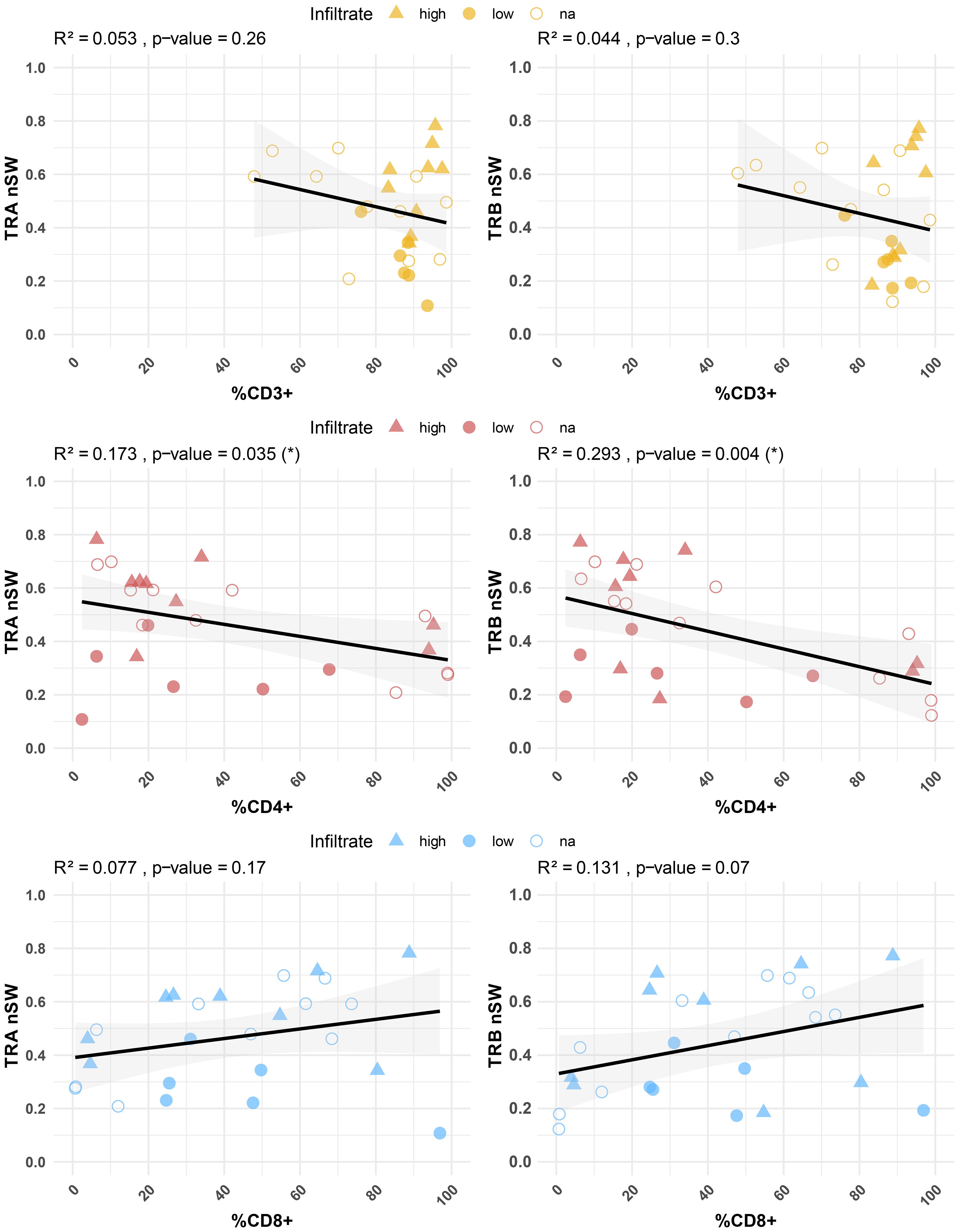 Figure 5. Correlation between TCR diversity (nS-W index) and percentages of CD3+, CD4+ and CD8+ T cells in minimally cultured TILs. Significant correlations were observed between CD4+ T cell percentages and diversity indices in both TRA (p = 0.03) and TRB (p = 0.004) sequences. IHC-defined infiltration levels are indicated: high (triangle) and low (filled circles). Unknown samples are represented by unfilled circles. Individual repertoire values are shown in Supplementary Figure 8.