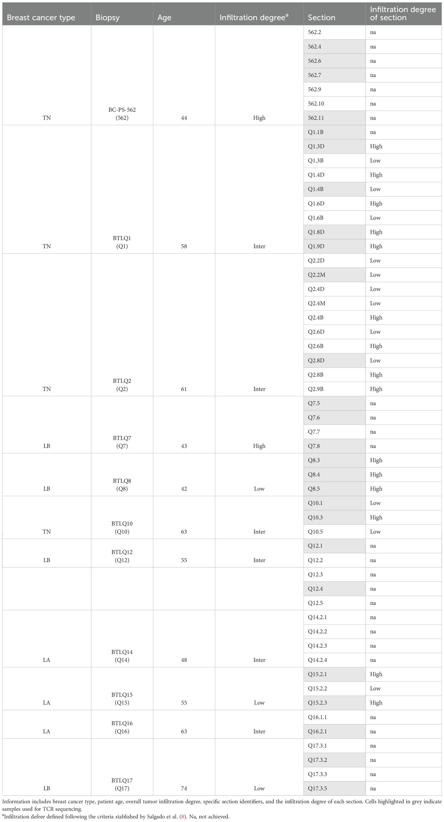 On the other hand, the T cell receptor (TCR), which provides antigen specificity to T cells, serves as a marker for monitoring the status and evolution of TILs. Diversity analysis reflects the number of distinct clones and their abundance, allowing for the identification of clonal expansions, indicating T cell activation and response. Additionally, we have previously analyzed the TCR repertoire in expanded CD4+ and CD8+ TILs reporting certain differences in their TCRs, some of them intrinsic to T cell subsets but others associated with the antitumoral response (13). However, the original repertoire may be biased during TILs expansions due to the greater proliferative capacity of certain clones. This has recently been demonstrated, although it was also observed that the expansion of TILs from different sections of the same tumor resulted in highly divergent repertoires (14). Consequently, culturing small sections of the same biopsy allows for multiple samples of TILs from the same tumor, but with different repertoires, encompassing a larger part of the original sample. Considering all this, the aim of this study was to explore these characteristics in TILs derived from 11 BC biopsies. Sections of each biopsy were cut and separately cultured as explants with no reagents used other than an external low supply of IL-2 (100U/ml) with the aim of preserving the originally divergent repertoires as much as possible (14).