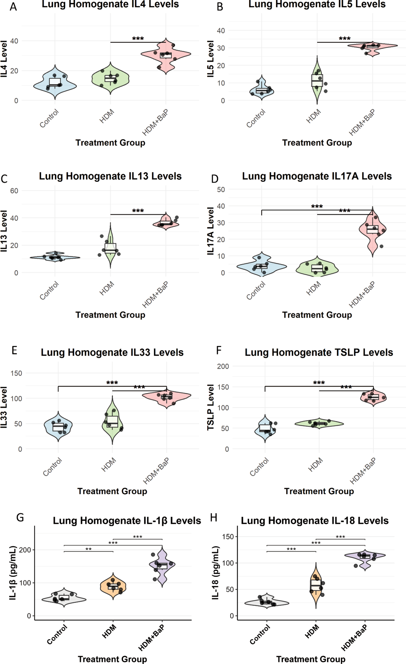 BaP co-exposure amplifies Th2/Th17 cytokine responses and epithelial alarmin expression in lung homogenates. Quantification of (A) IL-4, (B) IL-5, (C) IL-13 (Th2 cytokines), (D) IL-17A (Th17 cytokine), and (E) IL-33, (F) TSLP (epithelial alarmins), (G, H) IL-1β and IL-18 (proinflammatory cytokines) levels in lung homogenates from Control, House Dust Mite (HDM) challenged, and HDM + Benzo[a]pyrene (BaP) co-exposed mice. Each dot represents data from an individual mouse (n=6 mice per group). Data are presented as violin plots (displaying data distribution) overlaid with boxplots (showing median, 25th, and 75th percentiles) and jittered individual data points. Statistical significance was determined by one-way ANOVA followed by Tukey’s post-hoc test for multiple comparisons. Significant differences between groups are indicated by an asterisk: **p<0.01, ***p<0.001.