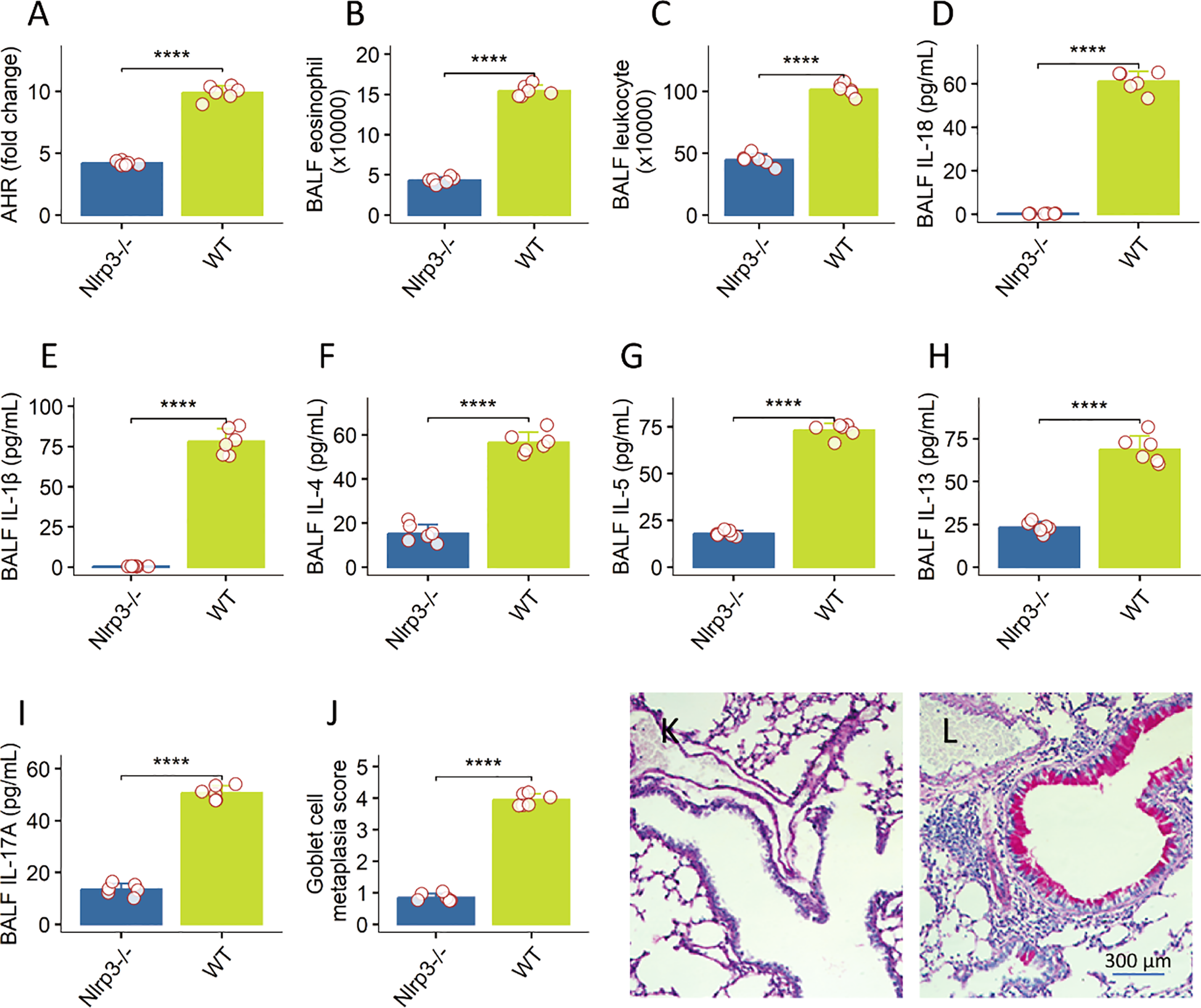 NLRP3 inflammasome is essential for pollutant-driven asthma exacerbation in a murine model. data representing various parameters of allergic airway inflammation were generated for Wild-type (WT) and Nlrp3-deficient (Nlrp3−/−) mice subjected to a HDM + BaP protocol, with 6 mice per group. (A) Airway Hyperresponsiveness (AHR): Nlrp3 deficiency significantly mitigated AHR, reflecting reduced airway constriction in response to methacholine challenge (the value was recorded at the last dose: 50 mg/mL). (B, C) BALF Total Leukocytes and Eosinophils: Nlrp3−/− mice showed significantly reduced total leukocyte counts and notably diminished eosinophil numbers in bronchoalveolar lavage fluid (BALF). (D–I) BALF Cytokines: Signature NLRP3-activated cytokines, IL-1β and IL-18, as well as the Th2 cytokines, were virtually undetectable in the BALF of Nlrp3−/− mice, in contrast to WT controls. (J–L) Goblet Cell Metaplasia: Quantification of goblet cells in lung sections demonstrated a substantial diminution of goblet cell metaplasia in the absence of Nlrp3 (J). (K, L), representative histology images show goblet cell metaplasia in the lung. Data are presented as mean ± Standard Error of the Mean (SEM). Individual mouse data points are shown as jittered dots. Statistical comparisons between WT and Nlrp3−/− groups for each parameter were performed using unpaired Welch’s t-tests. P-values are indicated as: ****p < 0.0001. These findings highlight the critical role of the NLRP3 inflammasome in exacerbating allergic airway inflammation.