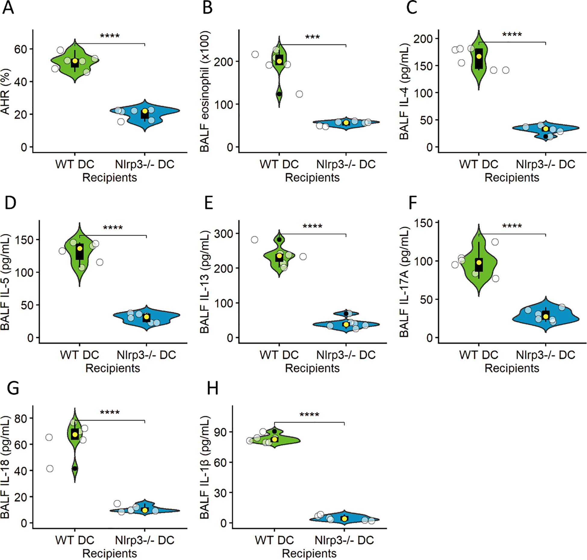 NLRP3-dependent dendritic cells are sufficient to drive allergic airway inflammation. Lung dendritic cells (DCs) isolated from HDM+BaP-treated wild-type (WT) or Nlrp3-deficient (Nlrp3−/−) mice were adoptively transferred into naïve recipients, followed by an HDM challenge. The panels illustrate various hallmarks of allergic airway inflammation in these recipient mice: (A) Airway hyperresponsiveness (AHR), (B) Eosinophilic inflammation (quantified as eosinophils per BALF), (C) IL-4, (D) IL-5, (E) IL-13, (F) IL-17A, (G) IL-18 and (H) IL-1β levels (all Th2/Th17 cytokines measured in lung homogenates in pg/mL). Recipients of WT DCs developed robust AHR, significant eosinophilic inflammation, and elevated Th2 (IL-4, IL-5, IL-13) and Th17 (IL-17A) cytokine levels in the lung. In stark contrast, Nlrp3−/− DC recipients exhibited significantly attenuated responses across all measured parameters, indicating that NLRP3 expression within DCs alone is critical and sufficient to orchestrate allergen-driven immunopathology. Data are presented as median (IQR) with individual data points (n=6 mice per group). Statistical significance was assessed using independent t-tests; ***p < 0.001, ****p< 0.0001.