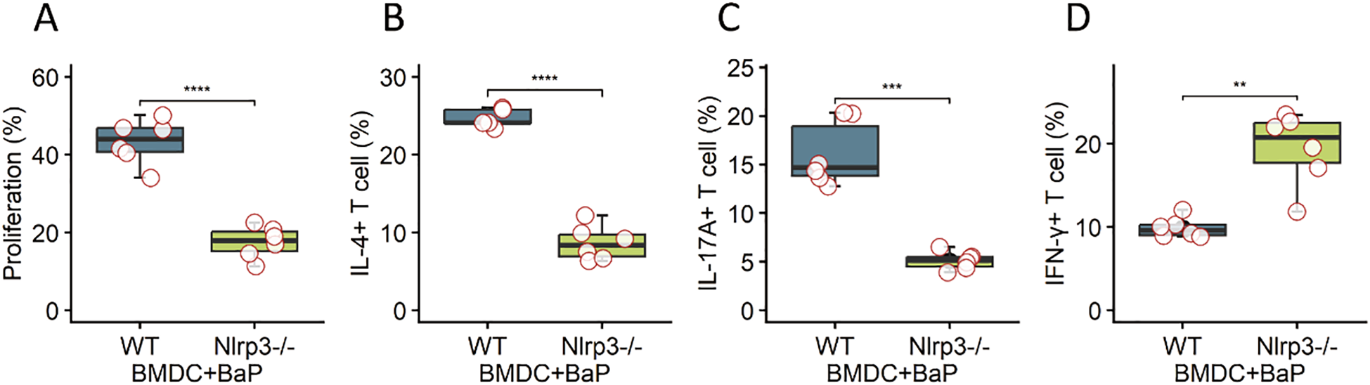 Finally, we examined T cell priming by NLRP3-activated DCs. OVA-pulsed BMDCs from WT or Nlrp3−/− mice treated with BaP were co-cultured with OT-II CD4+ T cells. Co-culture with WT BMDCs plus BaP promoted T cell proliferation (Figure 6A) and skewed differentiation toward IL-4+ Th2 and IL-17A+ Th17 subsets, with a concurrent reduction in IFN-γ+ Th1 cells (Figures 6B, C). This phenotype was not observed with Nlrp3−/− BMDCs (Figure 6D). These findings establish DC-intrinsic NLRP3 as a critical link between environmental pollutant exposure and pathogenic T helper polarization (23).