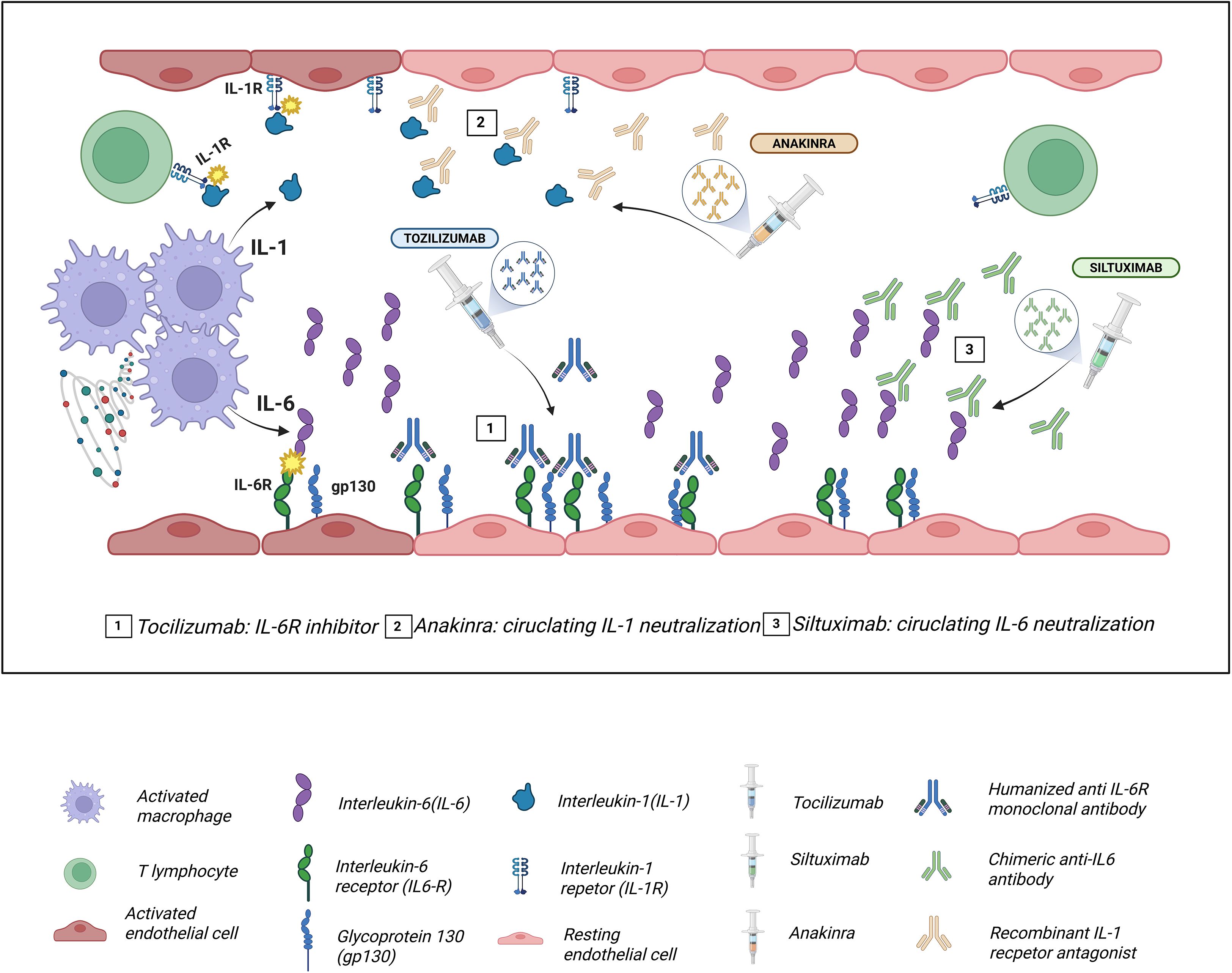 Figure 1. Molecular targets of the main drugs used in the management of cytokine release syndrome (CRS). Tocilizumab, a humanized monoclonal antibody against IL-6R, blocks both classical and trans interleukin-6 (IL-6) signaling, preventing Glycoprotein (gp130)/JAK-STAT3 activation and attenuating endothelial dysfunction, capillary leak, and hypotension characteristic of CRS. Siltuximab binds directly to circulating IL-6, neutralizing it and preventing its interaction with interleukin-6 receptor (IL-6R), thereby reducing systemic inflammatory amplification. Anakinra, a recombinant interleukin-1 receptor antagonist (IL-1R1a), inhibits IL-1α/IL-1β signaling via MyD88 and NF-κB, decreasing macrophage-mediated inflammation and contributing to the control of refractory CRS.