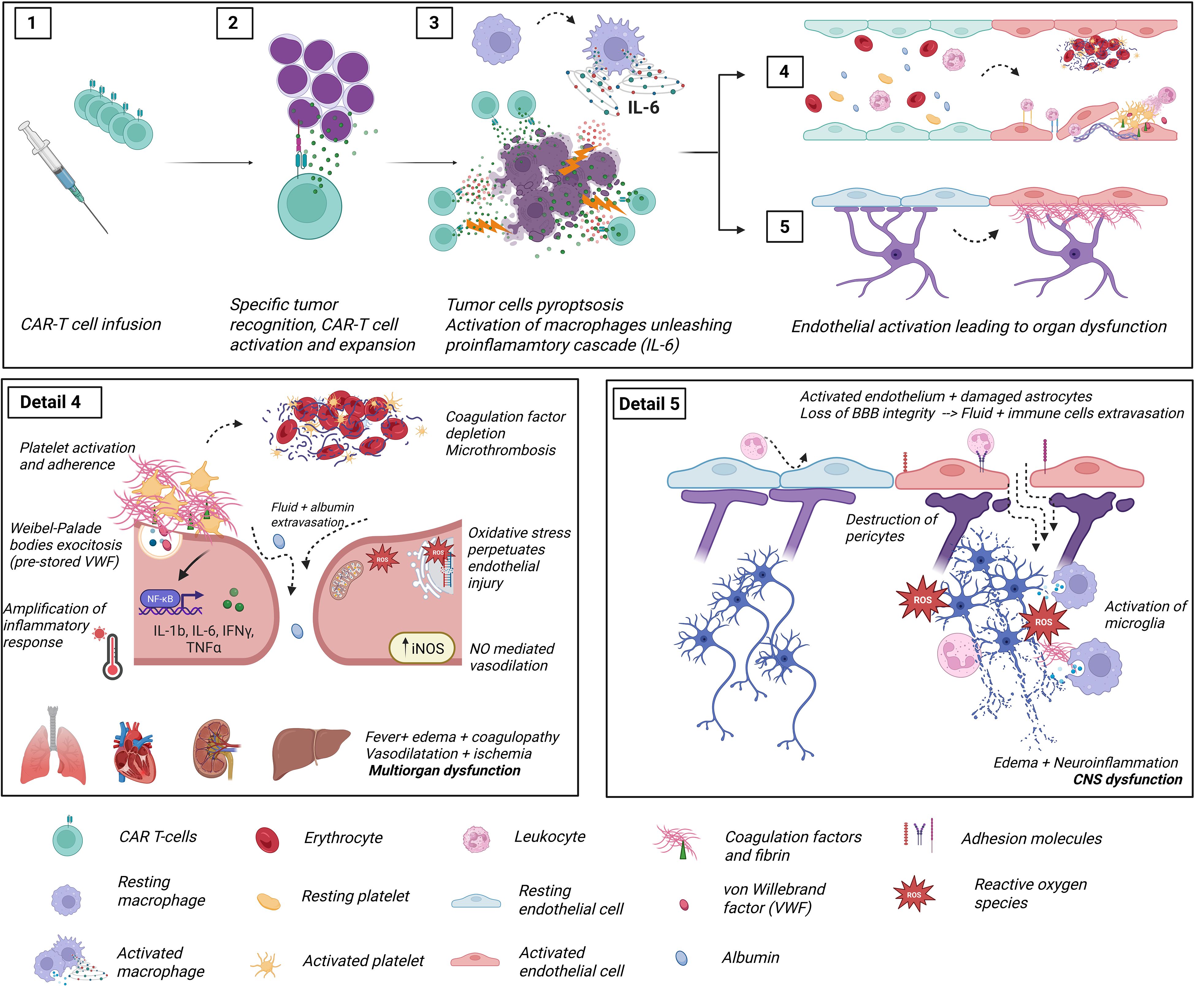 Figure 2. Diagram representing the pathophysiology of CAR-T cell treatment toxicities and its relationship with endothelial cells. Detail 1: CAR T-cells are infused into the patient. Detail 2: CAR T-cells recognize tumor antigens through their chimeric receptor, leading to activation and clonal expansion of the CAR T-cell population. Detail 3: Activated CAR T-cells release induce pyroptosis (inflammatory cell death) of tumor cells, triggering the release of high levels of damage-associated molecular patterns (DAMPs), which are recognized by pattern recognition receptors (PRRs) on host macrophages and monocytes to secrete additional cytokines (IL-6, TNFα…). These pro-inflammatory cytokines have an activating effect on ubiquitous endothelial layers. Detail 4: Longitudinal section of a blood vessel showing the normal disposition of an endothelial layer (blue cells). The red cells depict activated endothelial cells and their consequences (Panel 4 detail): endothelial cells lose their tight junctions, and fluid extravasation occurs. Additionally, dysfunctional endothelial cells switch their secretory phenotype of anticoagulant and fibrinolytic factors towards a hypercoagulative and hypofibrinolytic state due to increased release of PAI-1 and preformed TF and VWF. Intravascular microthrombi and liberation of neutrophil extracellular traps result in turbulent blood flow and agglutination of circulating cells, ultimately leading to tissue hypoperfusion. In addition, detached endothelial cells pass to circulation as Circulating Endothelial Cells (CECs), exposing the extracellular matrix, highly reactive to circulating platelets. The activation of iNOS increases NO availability, with both a vasodilatory effect in smooth muscle and oxidative cell damage. Ultimately, dysfunctional endothelial cells further amplify the cytokine release syndrome via upregulation of nuclear factor kappa B, which is linked to the inflammatory and oxidative stress responses. Detail 5: Longitudinal section of blood-brain barrier (BBB) showing analogous activation of endothelial cells responsible for ICANS. The pericytes, a mainstay of the BBB regulation, become inured following endothelial activation, leading to fluid and cell leakage into the cerebral parenchyma. This penetration of the central nervous system is followed by activation of microglia and neuroinflammation, responsible for the typical clinical picture of ICANS. This figure was created with BioRender.com (Diaz-Ricart, M. (2025) https://BioRender.com). CECs: circulant endothelial cells; CRS, Cytokine release syndrome; ICANS, Immune effector cell associated neurotoxicity syndrome; IFNγ, interferon gamma; IL, interleukin; iNOS, inducible nitric oxide synthase; NO, nitric oxide; NETs, neutrophil extracellular traps; PAI-1, plasminogen activator inhibitor 1; ROS, reactive oxygen species; TF, tissue factor; TNFα, tumor necrosis factor α; VWF, Von Willebrand factor.
