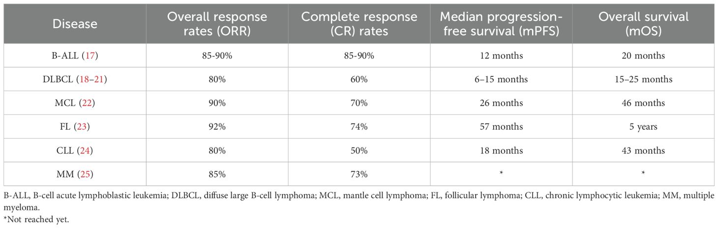 CAR T-cell kinetics, clinical outcomes, B-cell aplasia duration, and persistence vary significantly across indications and products (2). In CD19-directed CAR T-cell therapy, B-cell aplasia is strongly correlated with CAR T-cell persistence (17). Generally, CD28-based constructs exhibit rapid expansion and shorter persistence, while 4-1BB-based products display slower expansion but longer in vivo survival. Other factors influencing persistence include T-cell subset composition (e.g., naive vs. memory T-cells), disease type, and the characteristics of the tumor microenvironment (TME) (2). Clinical outcomes vary across diseases. Reported overall response rates (ORR), complete response (CR) rates, median progression-free survival (mPFS), and overall survival (mOS) are summarized in Table 1.