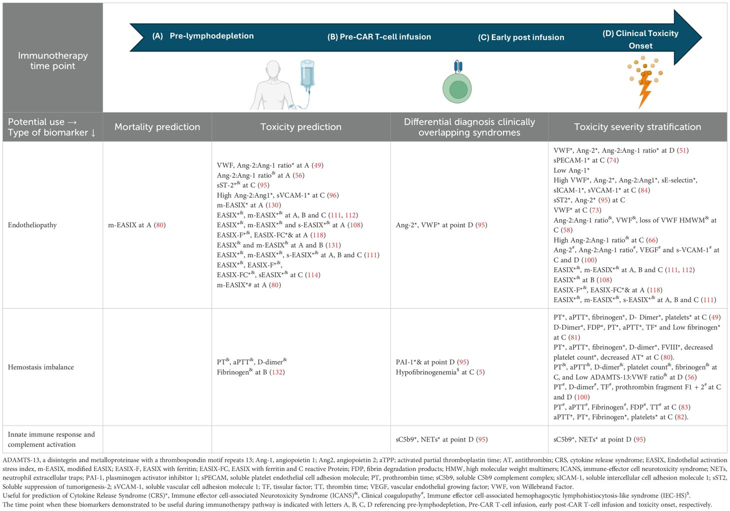 Table 2. Circulating biomarkers and surrogate scores of endothelial dysfunction, hemostasis misbalance, and other linked pathways, and their potential clinical uses in each moment during CAR T-cell immunotherapy.