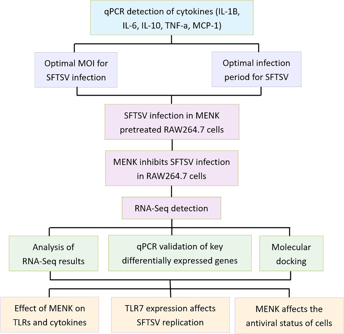 DEGs, differentially expressed genes; GO, gene ontology; IMQ, imiquimod; KEGG, Kyoto encyclopedia of genes and genomes; MENK, methionine enkephalin; MOI, multiplicity of infection; RNA-seq, RNA sequencing; SFTS, severe fever with thrombocytopenia syndrome; SFTSV, Severe fever with thrombocytopenia syndrome virus; TLR, toll-like receptor.
