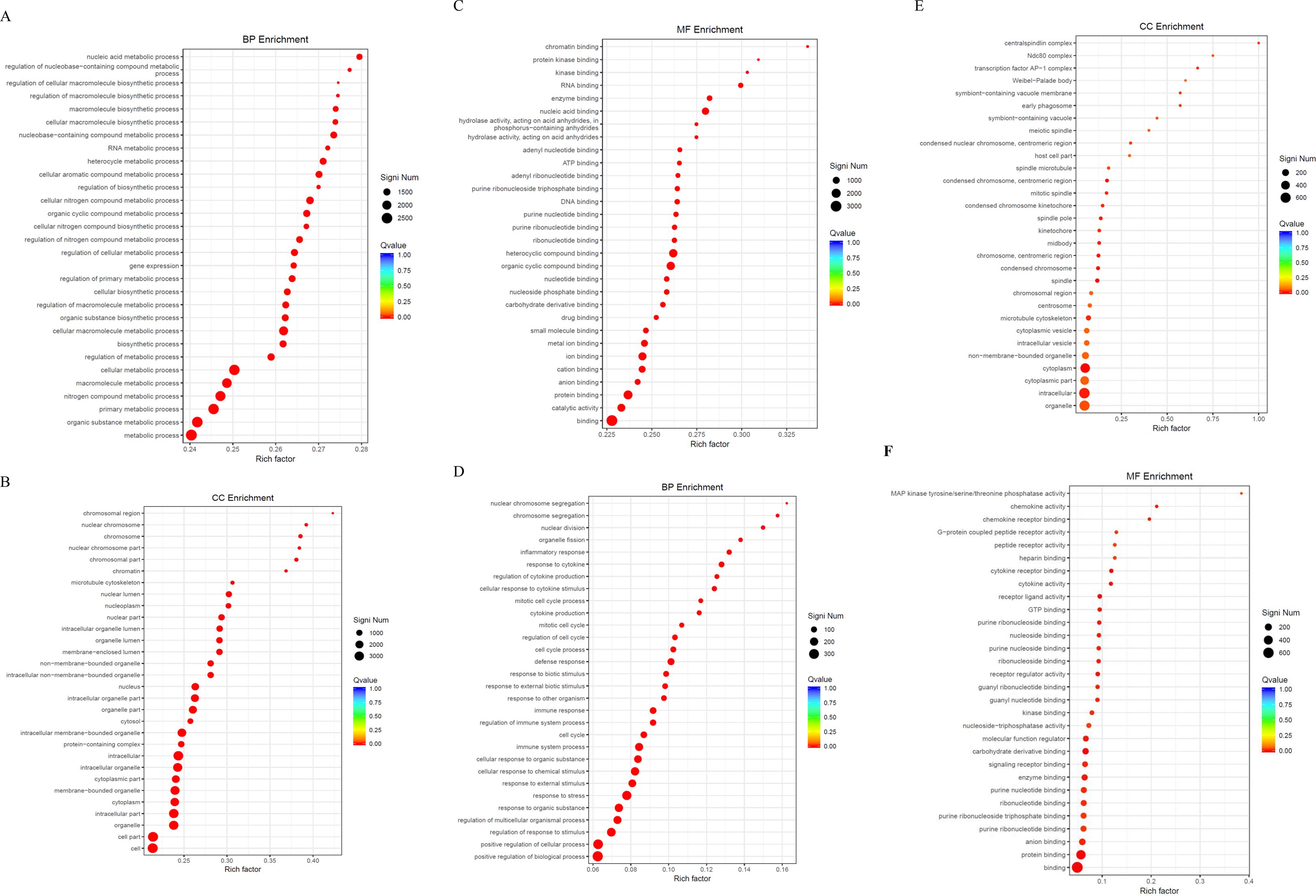 Figure 7. GO enrichment analysis. (A) Bubble plot of DEGs in the BP category for the SFTSV and Control groups. (B) Bubble plot of DEGs in the CC category for the SFTSV and Control groups. (C) Bubble plot of DEGs in the MF category for the SFTSV and Control groups. (D) Bubble plot of DEGs in the BP category for the MENK–SFTSV and SFTSV groups. (E) Bubble plot of DEGs in the CC category for the MENK–SFTSV and SFTSV groups. (F) Bubble plot of DEGs in the MF category for the MENK–SFTSV and SFTSV groups. The color gradient of the dots represents the magnitude of the Q-value, with intense red coloration indicating small Q-values. The size of each dot corresponds to the number of DEGs within each functional term, where large dots denote terms containing large numbers of DEGs.