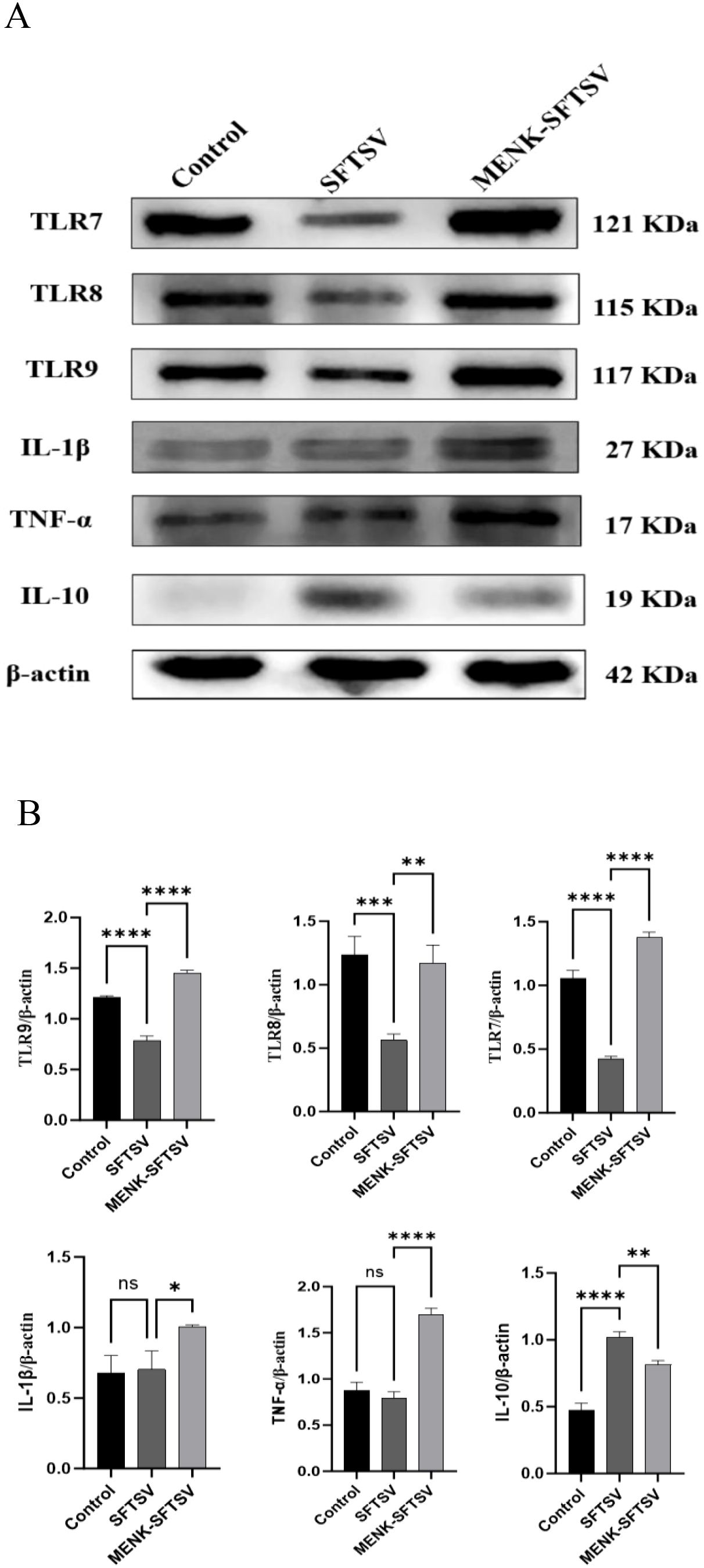 Figure 11. MENK upregulated TLR in RAW264.7 cells and modulated cytokine production. (A) Western blot analysis of TLR7, TLR8, TLR9, IL-1β, TNF-α, and IL-10 protein expression levels in the Control, SFTSV, and MENK–SFTSV groups. (B) Histograms of the grayscale analysis of the corresponding proteins. Control group vs. SFTSV group and SFTSV group vs. MENK-SFTSV group, *P < 0.05, **P < 0.01, ***P < 0.001, ****P < 0.0001.